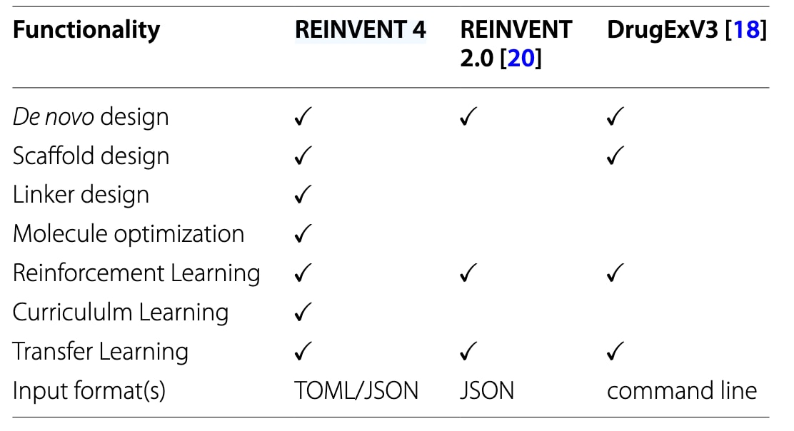该研究描述了REINVENT作为生成式分子设计框架的发展。REINVENT已投入实际药物研发使用,并持续维护。其利用强化学习结合RNN与Transformer架构,以SMILES为分子表示解决逆向设计问题。新版REINVENT 4强调多项新特性,包括强化学习与课程学习的组合式分阶段训练、新的Transformer模型、在迁移学习、强化学习与课程学习框架中对所有生成器的全面整合、采用插件系统改写的评分子系统以及除了JSON外新增的TOML配置格式。REINVENT 4具有结构清晰且功能完整的软件实现,代码库几乎完全重写并集中托管于同一仓库。此前版本1与2.0已有详细发表,版本3虽开源但未附对应论文。REINVENT在采样效率上已优于多种方法,并在最近的对接基准中展示了生成逼真3D结构的能力。此外,也有研究表明在特定课程学习策略下,其能够生成超出训练集范围的化学结构。表1总结了REINVENT 4、REINVENT 2.0与DrugEx 3在功能上的差异,DrugEx亦是与REINVENT理念相近并投入实际使用的开源生成式AI平台。