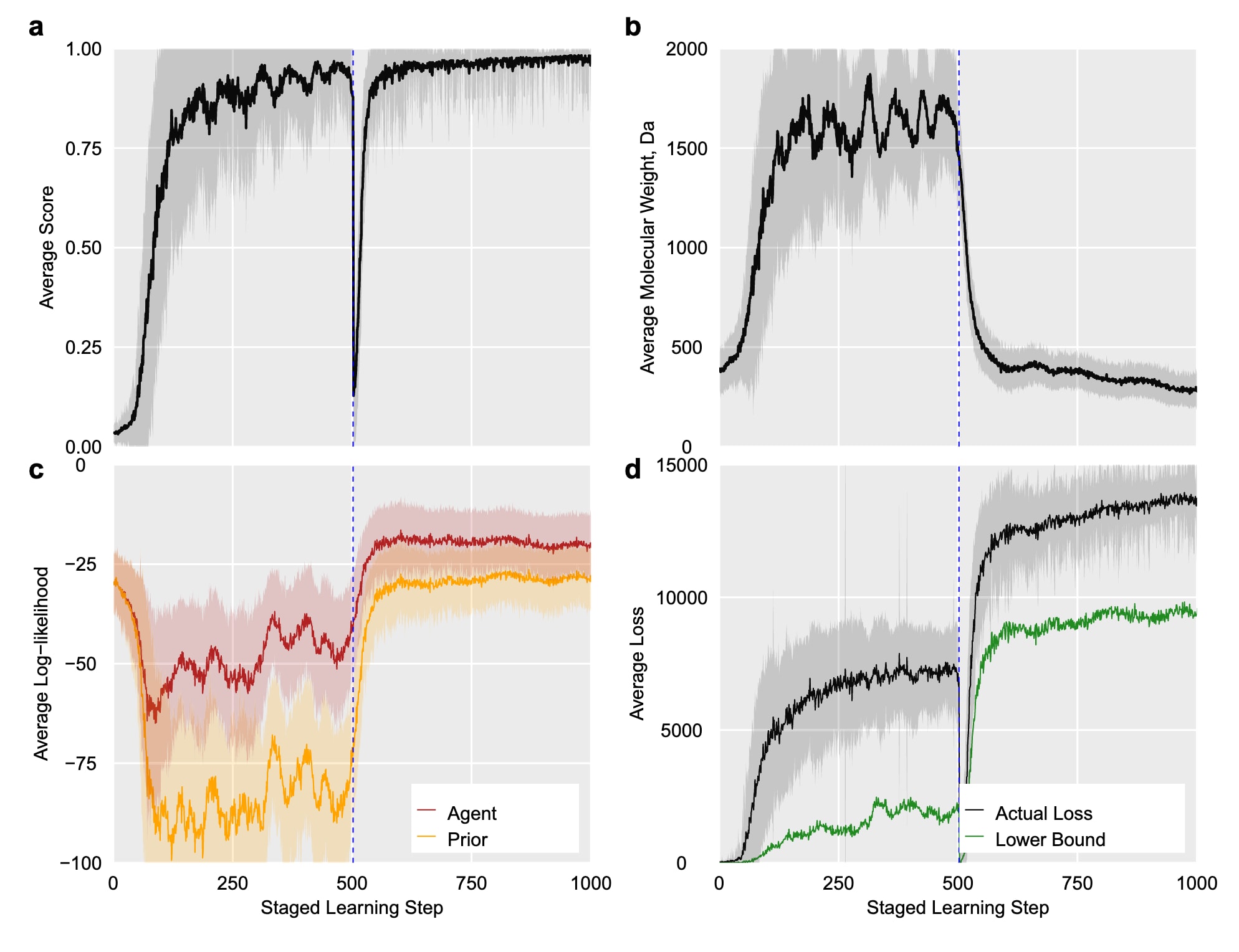 图2|展示了一个简单实验,用于说明默认REINVENT 4 agent的可适应学习行为。 首先进行500个epoch的强化学习,评分函数奖励分子量≥1500 Da;随后在第二阶段切换评分函数,奖励分子量≤1500 Da。图中分别给出了每个epoch结束时所有分子的平均得分a、平均分子量b、agent与prior的平均似然c以及损失函数d,同时在d中标示了损失下界(公式7)。虚线表示评分函数切换的时间点。该次实验使用默认设置:batch size为128,σ为128。