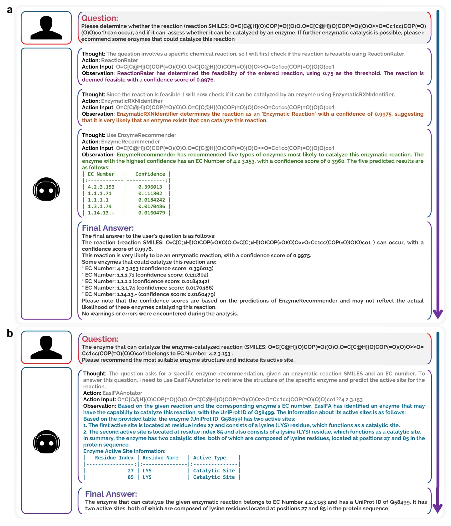 图3 | 展示了ChemEnzyRetroPlanner智能体的酶推荐案例研究。 a展示了反应可行性判断、酶促反应识别与酶推荐的推理示例,所用反应案例为4-(hydroxymethyl)-2-furancarboxaldehydephosphate(4-HFC-P)的合成。b展示了针对4-HFC-P合成的具体酶推荐结果,该推荐基于a中预测得到的最可能EC编号4.2.3.153,并包含对活性位点的验证。