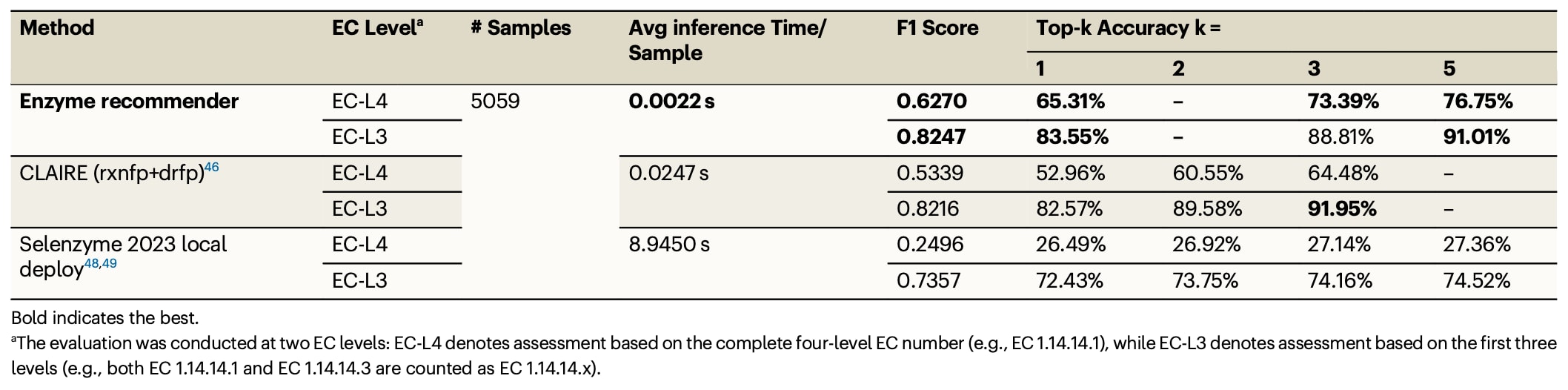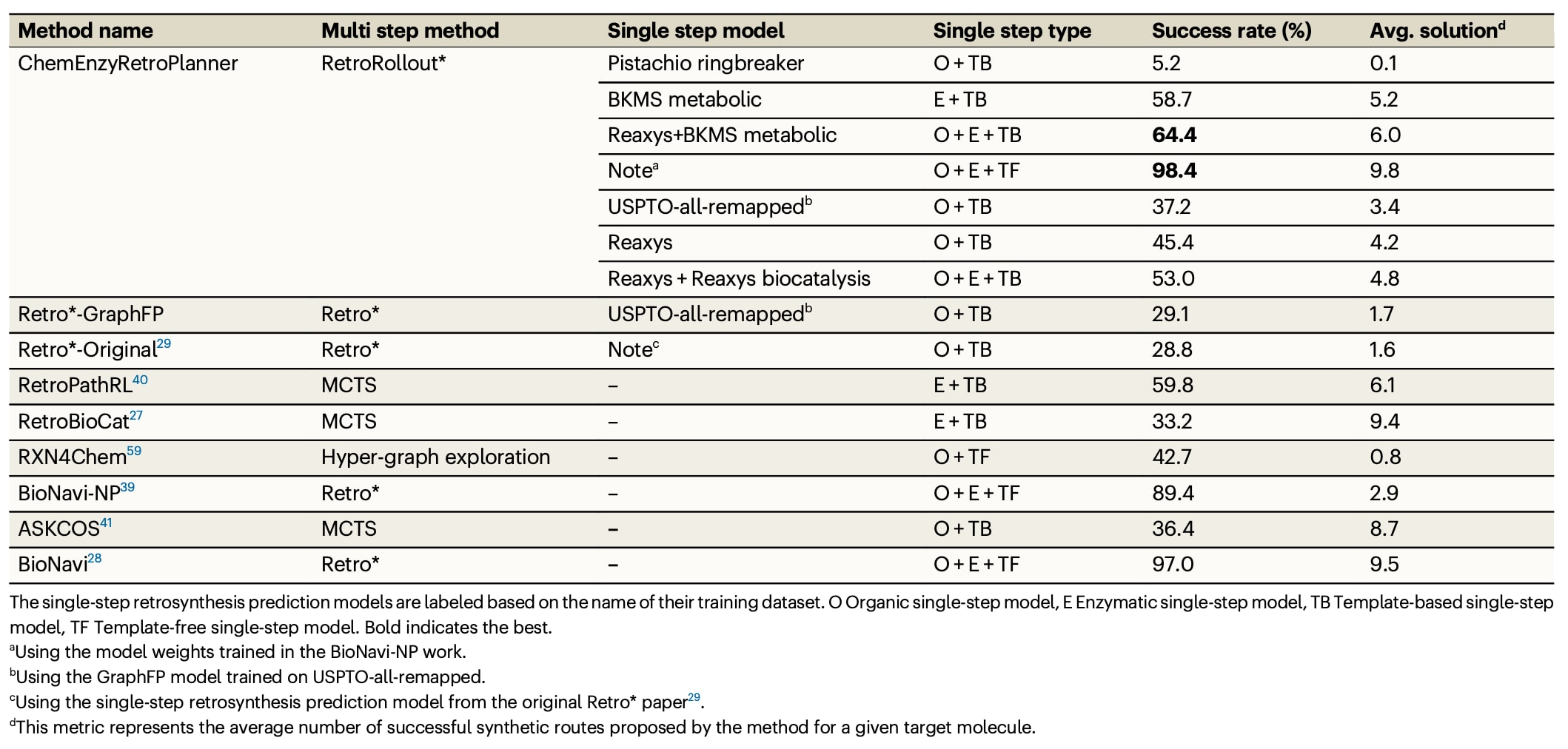 表5 | 展示了ChemEnzyRetroPlanner内置的酶推荐模型的基准测试结果,并与其他主流酶推荐方法进行对比。