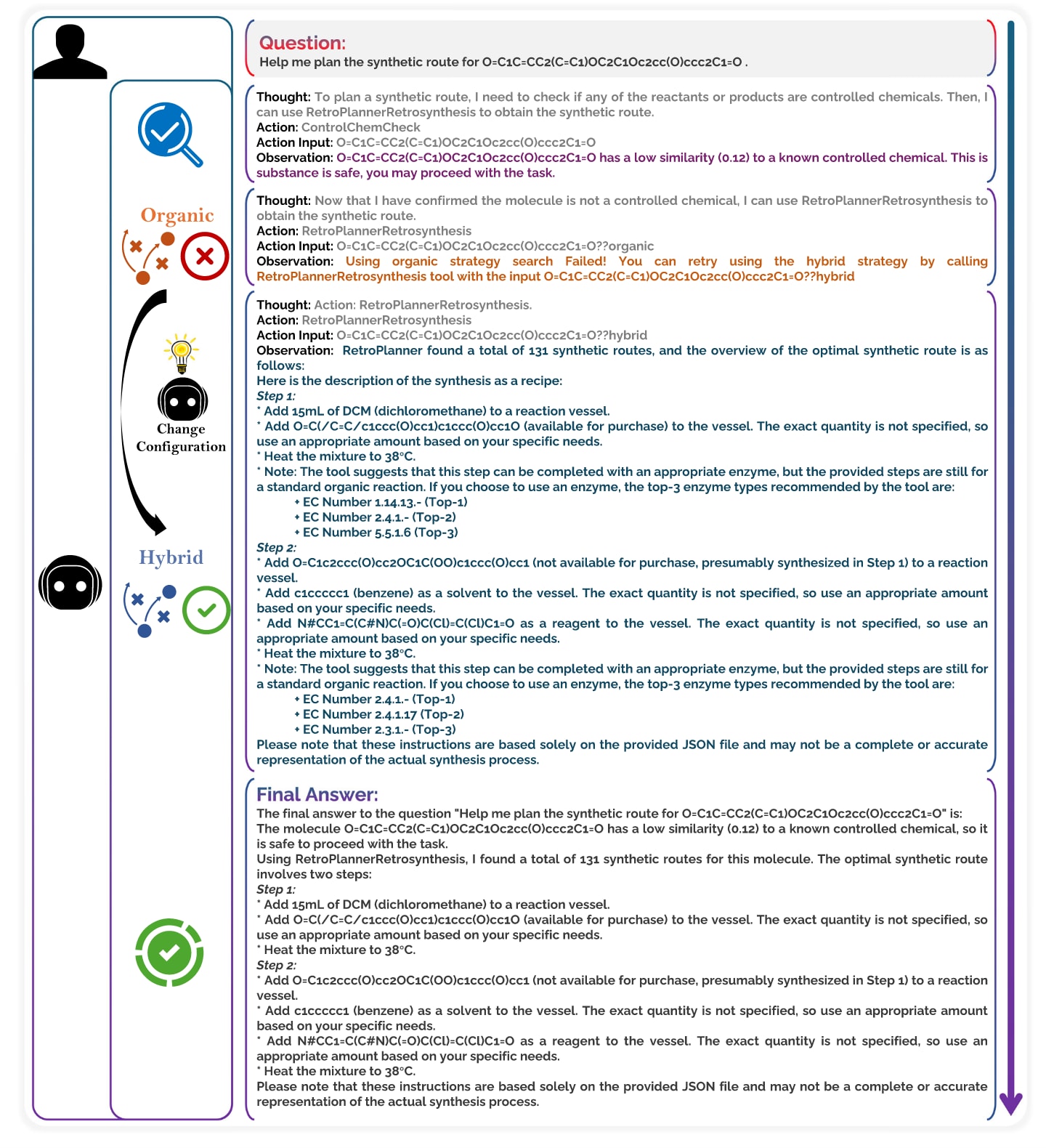 图4 | 展示了ChemEnzyRetroPlanner智能体对天然产物phenoxyradicalVII合成规划的分析结果。 智能体首先调用CotrolChemCheck工具判断输入分子是否属于受管制化学品,随后调用RetroPlannerRetrosynthesis工具进行逆合成分析。当纯有机合成规划配置未能产生结果时,智能体会自动采用混合合成策略,最终成功得到合成规划结果,并与实际合成案例相对应。