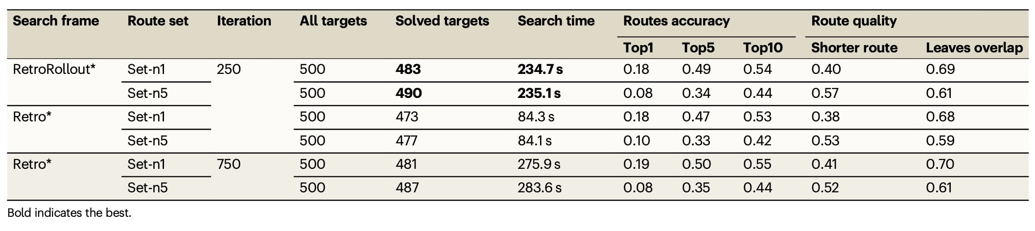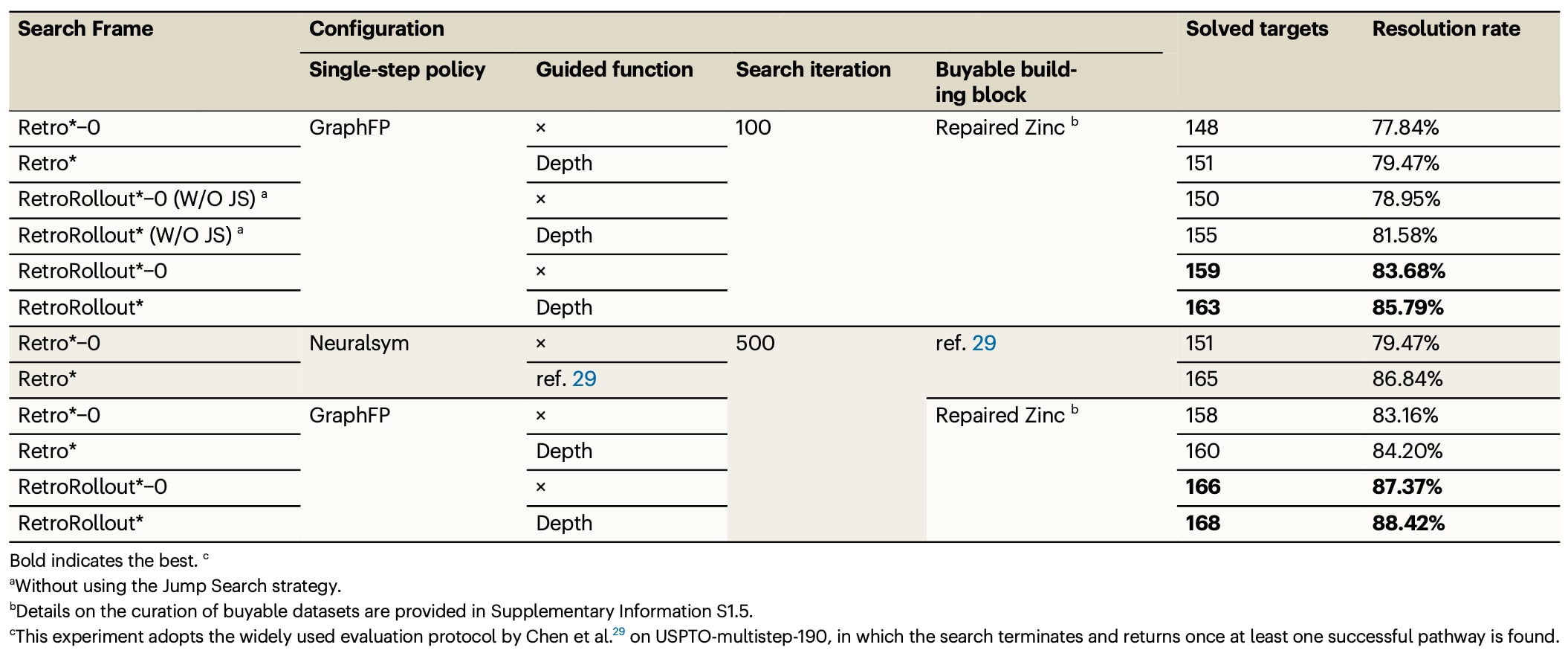 表1 | 展示了ChemEnzyRetroPlanner中,RetroRollout在USPTO-multistep-190测试集上的表现,并与Retro进行对比。
