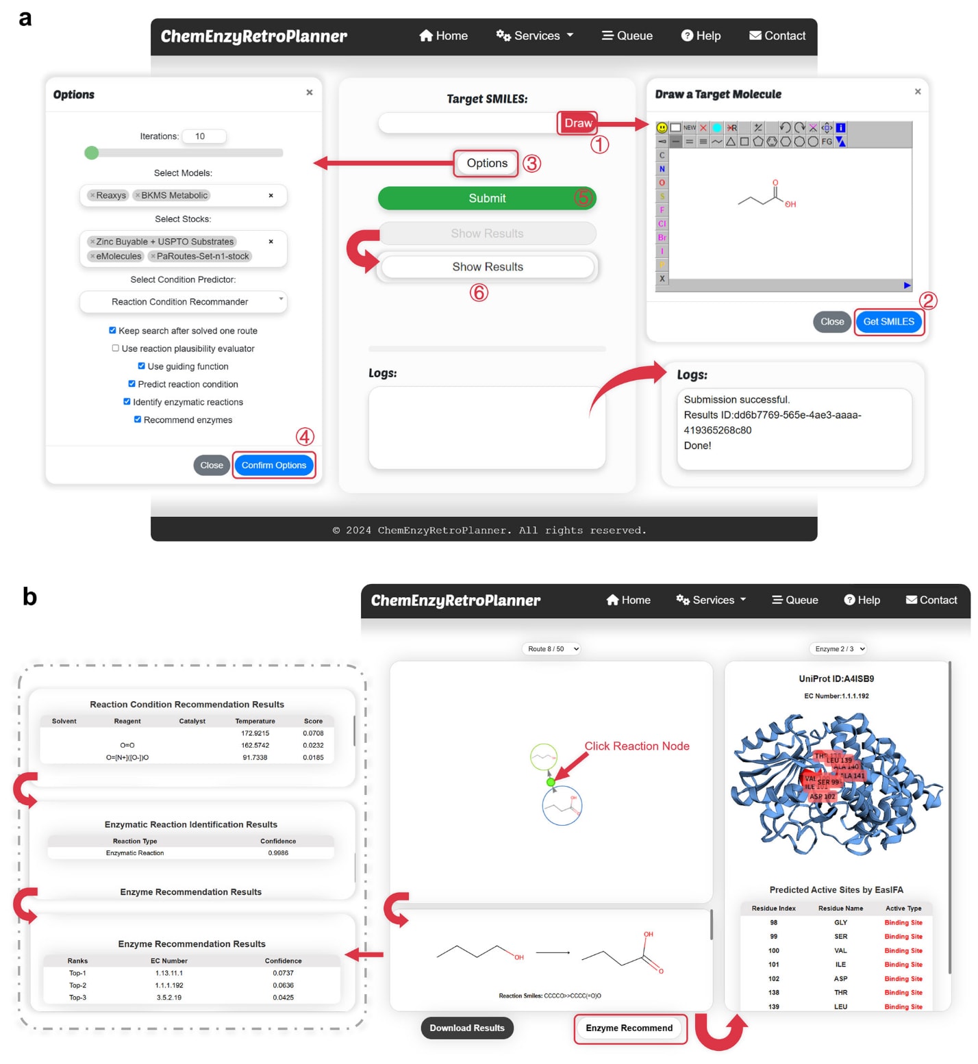 图2 | 展示了有机-酶催化混合合成规划平台ChemEnzyRetroPlanner的平台界面。 a为参数选择界面与日志输出界面;b为平台的合成路径展示界面与酶活性位点展示界面。