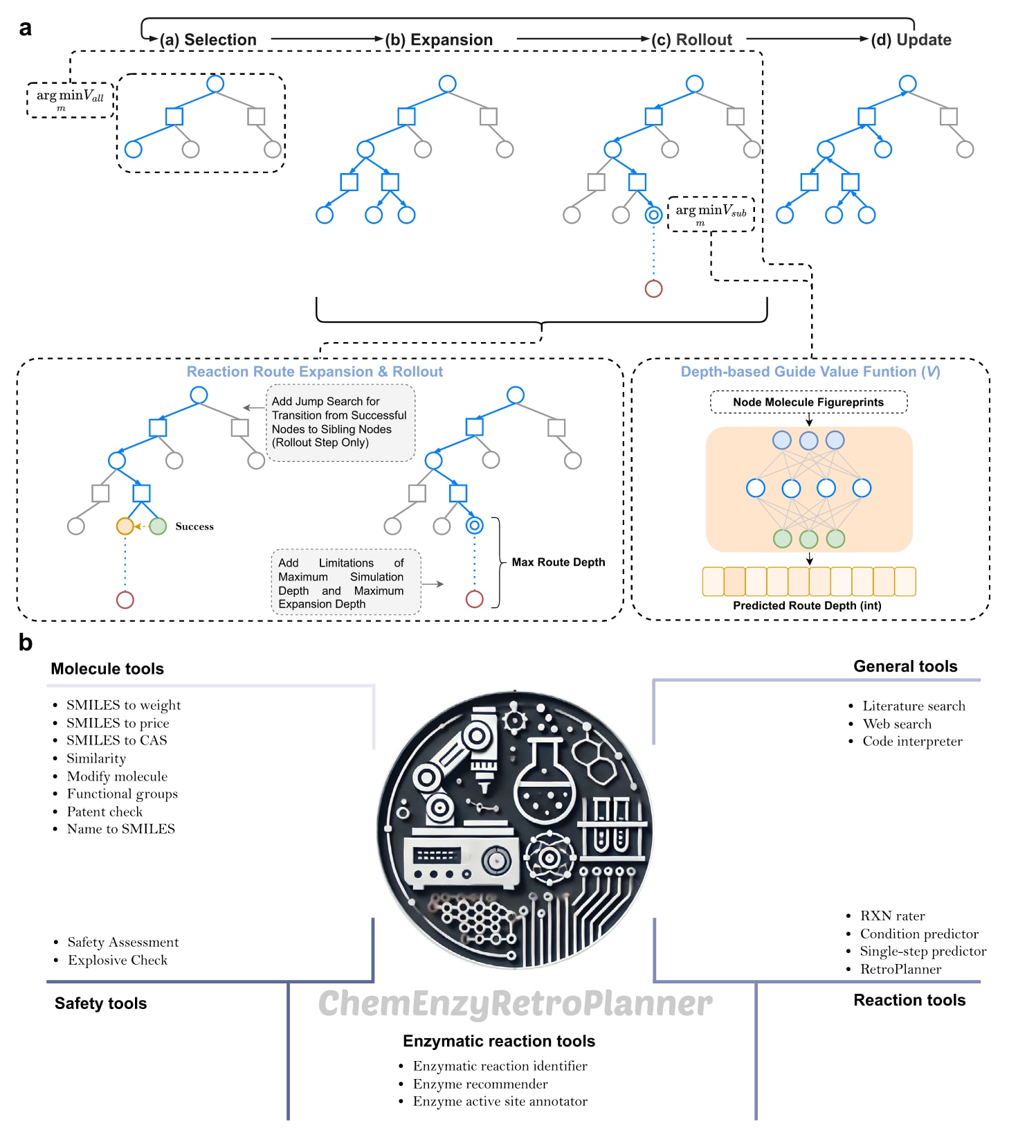 图5 | 展示了ChemEnzyRetroPlanner中搜索框架与智能体工具集增强的总体概览。 a展示了RetroRollout*在算法层面的改进示意,关键步骤包括Selection、Expansion、Rollout与Update,并给出了在Rollout阶段进行跳跃搜索(jumpsearch)的过程示意;算法伪代码见补充信息S1.8。这里,m表示一个分子节点,Vall表示全局成本列表,Vsub表示与分子节点m对应的所有子节点的累计子树成本。b展示了ChemEnzyRetroPlanner智能体实现的工具集,包括分子工具、反应工具、安全评估工具、通用工具与酶促反应工具,共同支持灵活且可扩展的智能体行为。RXN表示reaction。