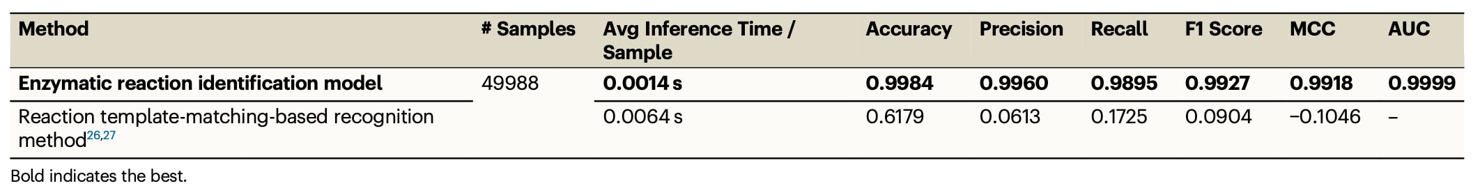 表4 | 展示了ChemEnzyRetroPlanner内置的酶促反应识别模型的基准测试结果,并与基于反应模板匹配的识别方法进行对比。