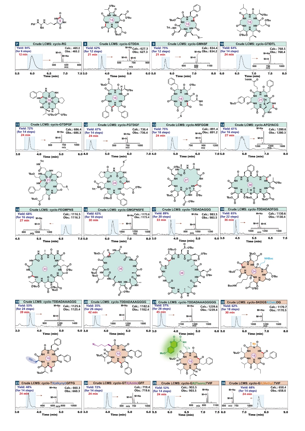 图 4| 不同环尺寸下天然与非天然环肽的自动化快速合成。 所有粗产物均直接从自动化合成系统中收集,未经纯化即通过LC-MS分析以评估粗品纯度。产物收率采用