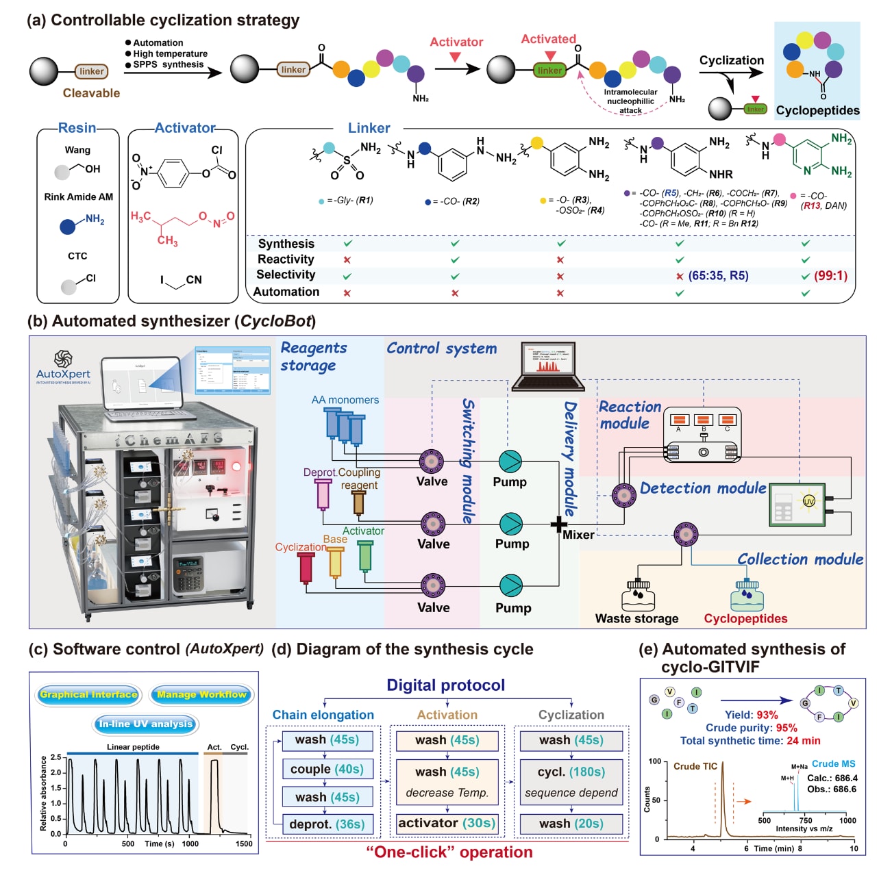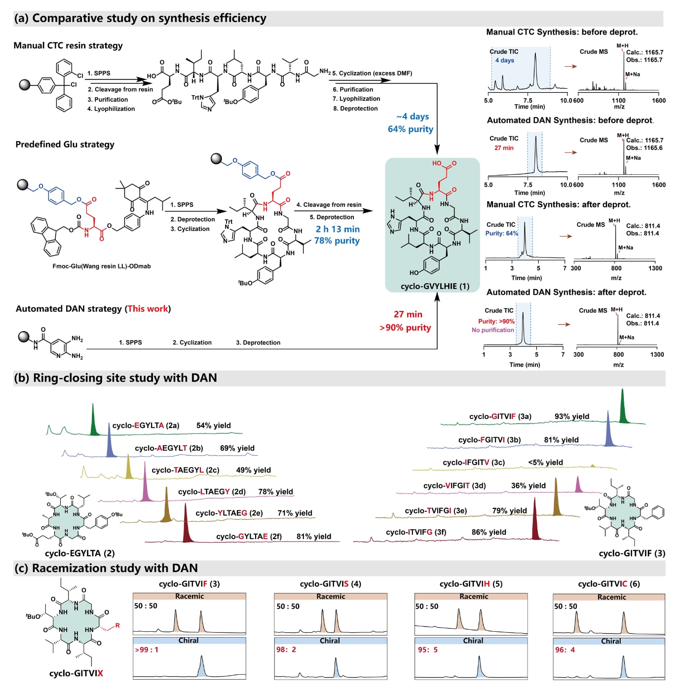 环肽在结构稳定性和靶标特异性方面兼具生物大分子的优势,同时又具备小分子在化学合成上的高度灵活性。然而,在合成速度和效率方面,环肽的化学合成长期以来明显落后于核糖体介导的生物合成。该文提出了一种名为CycloBot的全自动合成平台,可在分钟尺度内实现环肽的全自动组装,其通量接近核糖体生物合成,并且同时兼容天然与非天然氨基酸。该技术的核心在于一种二氨基烟酸 (DAN) 支架,该支架可在固相条件下通过“一键式”操作同步完成头尾环化与切割反应,从而获得不同环尺寸的宏环肽,最高收率可达93%,粗品纯度超过95%,且几乎不发生消旋反应。该平台的实用性通过其在1天内快速构建包含20个成员的抗菌环肽文库得到了充分展示,其中筛选得到的先导化合物对金黄色葡萄球菌和枯草芽孢杆菌的抗菌活性相较于青霉素提高了约100倍。通过在核糖体合成速度与化学合成可实现的结构多样性之间建立连接,该技术为个性化环肽治疗药物的加速发现与开发确立了一种新的研究范式。