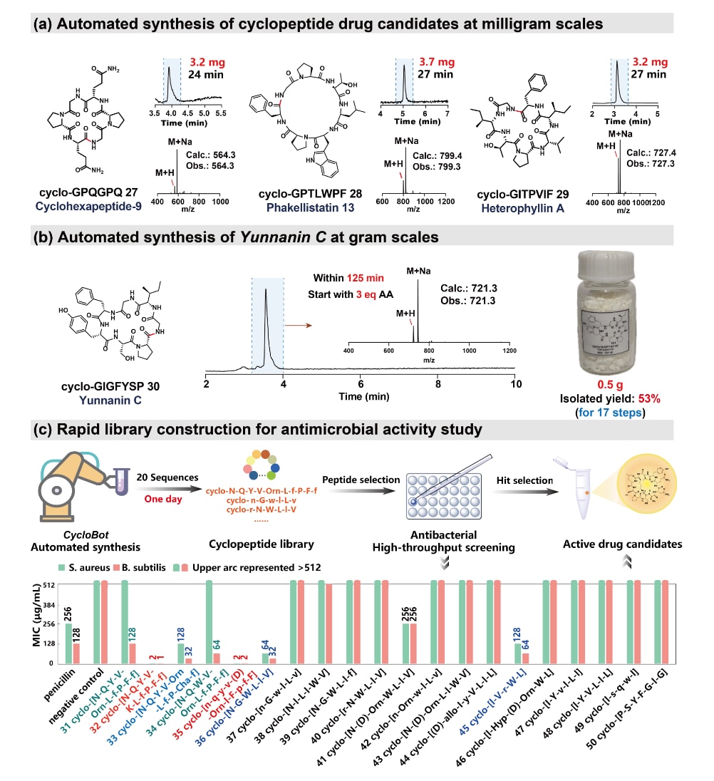 图 5| 面向治疗研发的环肽快速合成与生物活性筛选。 (a) 在毫克级规模下,抗衰老候选分子Cyclohexapeptide-9(27)以及抗癌候选分子Phakellistatin 13(28)和Heterophyllin A(29)均在数分钟内完成合成。(b) 利用每种氨基酸单体3当量并结合制备型HPLC纯化,在125分钟内实现了抗癌候选分子Yunnanin C(30)的克级合成,最终获得53%的分离收率。(c) 采用CycloBot平台在1天内构建了一个包含20个成员的环肽文库,并用于抗菌活性筛选。体外抗菌实验分别在金黄色葡萄球菌(S. aureus,ATCC 29213)和枯草芽孢杆菌(B. subtilis,ATCC 6633)中进行,以青霉素作为阳性对照(n=3,误差线包含于数据点内);肽序列中大写字母表示(L)-氨基酸,小写字母表示(D)-氨基酸。