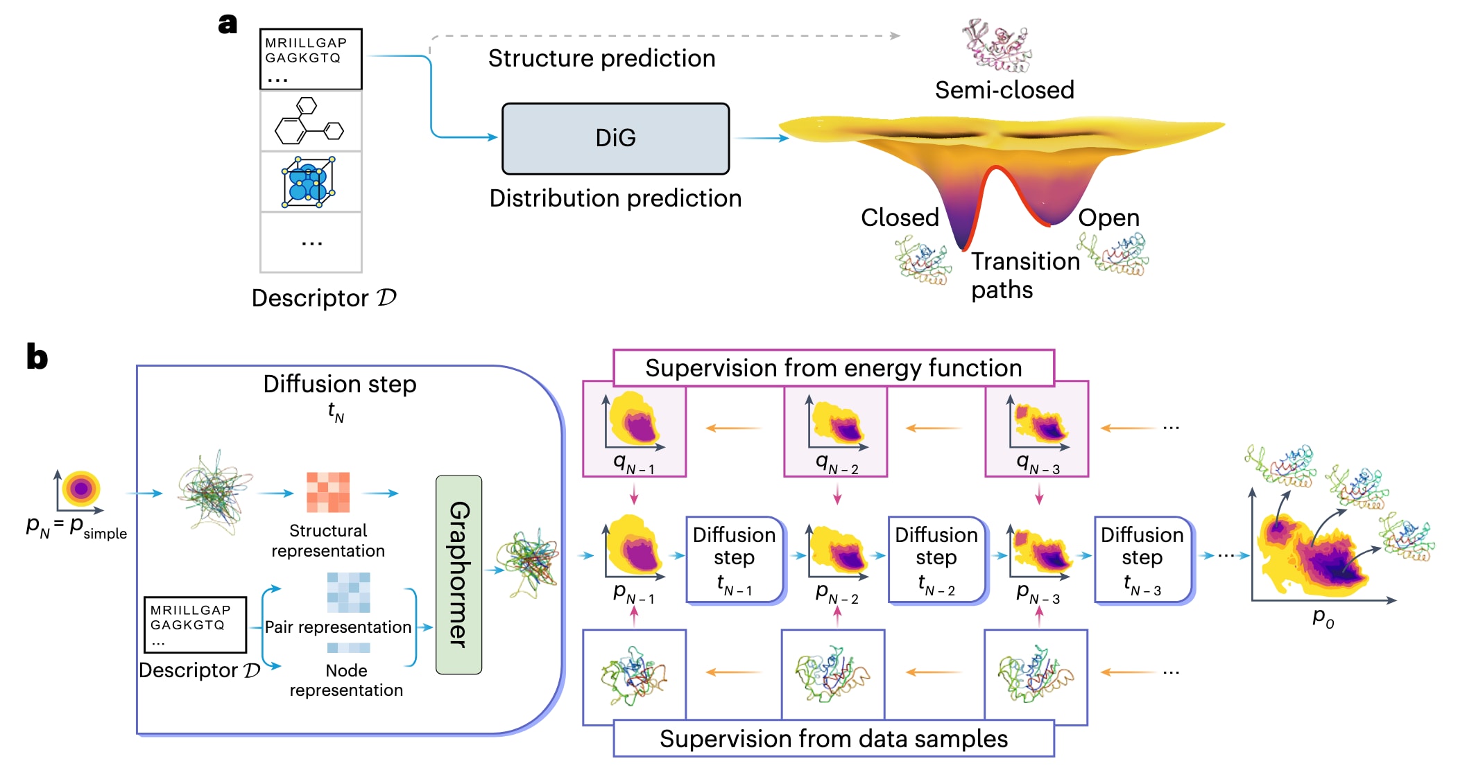 图1|利用DiG框架预测构象分布。 a,DiG以目标分子体系的基础描述符DD作为输入,例如氨基酸序列,生成一个结构概率分布,该分布旨在近似体系的平衡分布,并采样不同的亚稳态或中间态。相比之下,诸如AlphaFold等静态结构预测方法的目标是预测分子的单一高概率结构。b,用于预测分子结构分布的DiG框架。该框架以深度学习模型Graphormer作为核心模块,用于预测一个扩散过程(→),将简单分布逐步转化为目标分布。模型的训练目标是使每一个中间扩散时间步i所得到的分布
