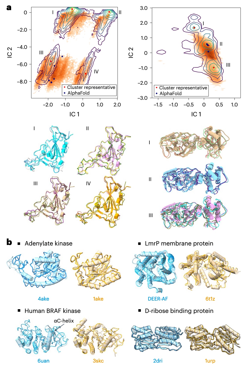 图2|蛋白质构象的分布与采样结果。 a,DiG生成的结构能够重现毫秒尺度分子动力学模拟中观察到的多样化构象。分子动力学模拟得到的结构被投影到由两个时间滞后独立成分分析坐标张成的低维空间中,即独立成分1和2,并通过等高线形式展示其概率密度。左图中,针对受体结合结构域蛋白,分子动力学模拟在该二维空间中揭示了四个高占据区域。DiG生成的结构被映射到同一二维空间中,以橙色点表示,其分布由颜色深浅反映。在分布图下方,将DiG生成的结构(细带状表示)与代表性结构进行叠加对比,同时给出了AlphaFold预测结构在该空间中的位置(以星号表示)。右图展示了SARS-CoV-2主蛋白酶的对应结果,并与分子动力学模拟和AlphaFold预测结果进行比较。等高线图显示出三个构象簇,DiG生成的结构主要覆盖簇II和簇III,而簇I中的结构相对不足。b,DiG在生成蛋白质多构象方面的表现。将DiG生成的结构(细带状表示)与实验解析结构进行对比,其中实验结构以其PDB编号标注,DEER-AF除外,该结构为AlphaFold预测模型,以圆柱状示意表示。对于腺苷酸激酶、LmrP膜蛋白、人类BRAF激酶以及D-核糖结合蛋白这四种蛋白质,DiG均能够较好地重现两种功能状态的结构,不同状态以青色和棕色加以区分。