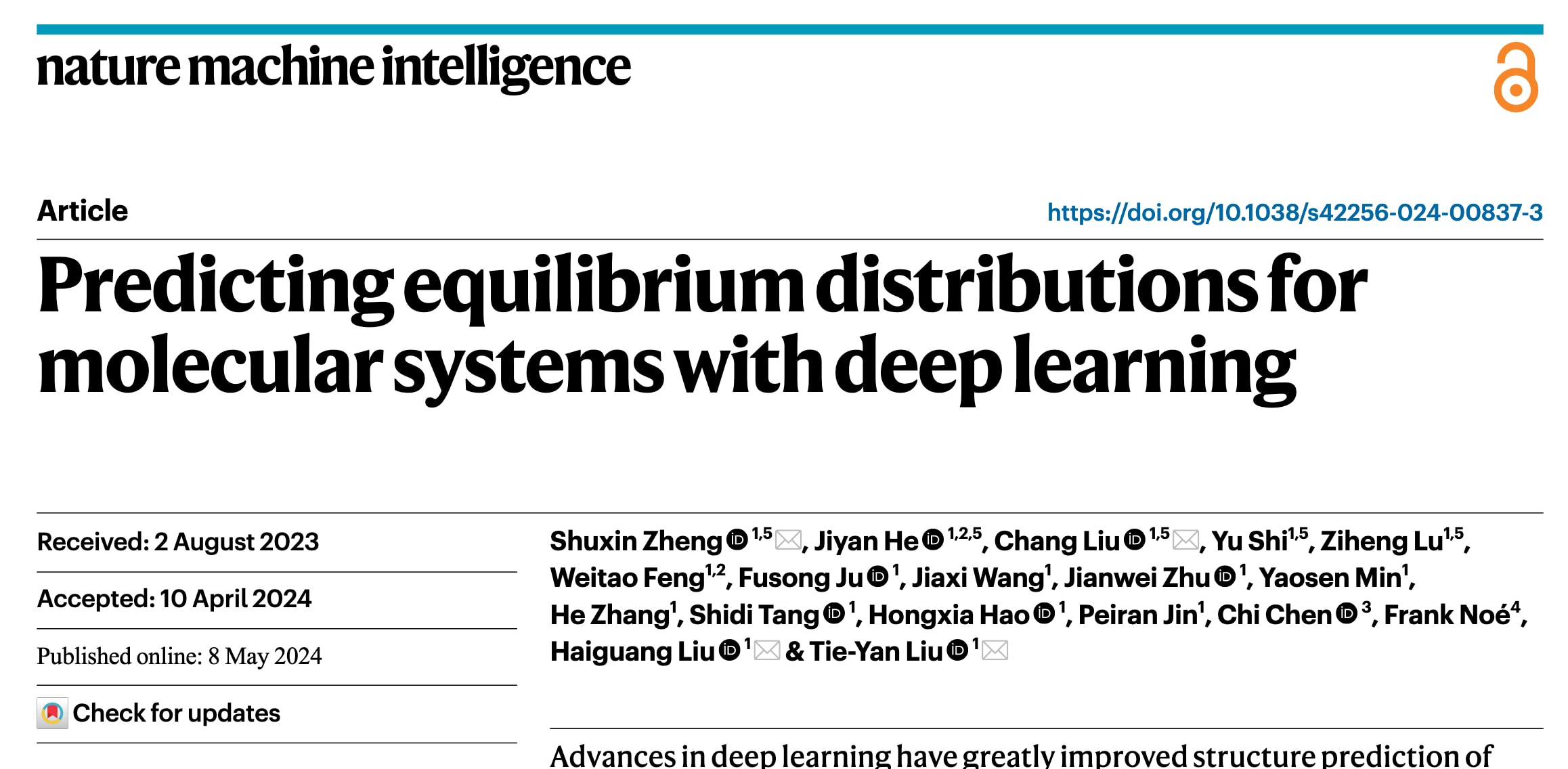 深度学习的进展极大提升了分子结构预测的准确性。然而,许多与实际应用密切相关的宏观观测量并不是由单一分子结构决定的,而是来源于结构的平衡分布。获取这类分布的传统方法,例如分子动力学模拟,计算成本高昂且在很多情况下难以实施。在此提出一种名为Distributional Graphormer(DiG)的深度学习框架,旨在预测分子体系的平衡分布。DiG受到热力学退火过程的启发,利用深度神经网络在给定分子体系描述符(如化学图或蛋白质序列)的条件下,将一个简单分布逐步变换为平衡分布。该框架能够高效生成多样化构象,并对状态密度进行估计,其速度相比传统方法提升了数个数量级。进一步展示了DiG在多种分子任务中的应用,包括蛋白质构象采样、配体结构采样、催化剂–吸附物采样以及性质引导的结构生成。DiG在分子体系统计理解的方法学上取得了显著进展,为分子科学研究开辟了新的可能性。
