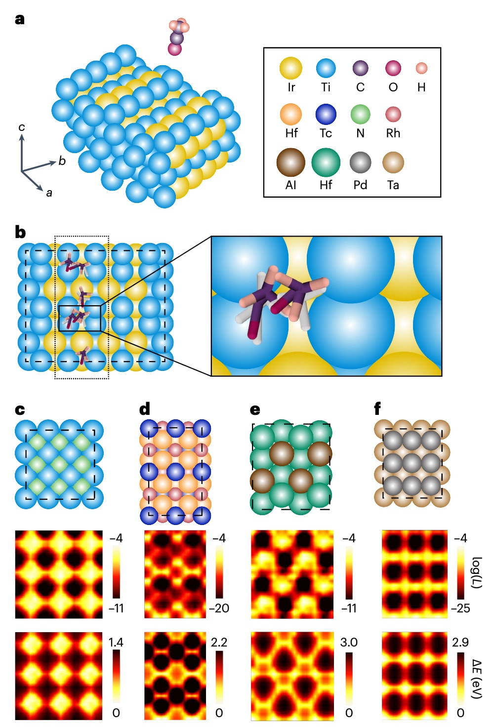 图4|DiG在催化剂–吸附物采样问题中的结果。 a,问题设定:预测吸附物在催化剂表面上的吸附构型分布。b,DiG预测得到的吸附位点及其对应构型(彩色显示)与密度泛函理论计算结果(白色显示)的对比。DiG能够识别出所有吸附位点,且预测得到的吸附物结构与密度泛函理论计算结果高度接近,有关吸附位点与构型的详细信息见补充资料。c–f,单个N或O原子在TiN、RhTcHf、AlHf和TaPd催化剂表面上的吸附预测结果,并与密度泛函理论计算结果进行对比。上方面板展示催化剂表面结构,中间面板给出了吸附物在对应催化剂表面上的概率分布,以对数尺度表示,下方面板展示了通过密度泛函理论方法计算得到的吸附物与催化剂之间的相互作用能。预测得到的吸附位点及其概率分布与密度泛函理论所揭示的能量景观具有高度一致性。