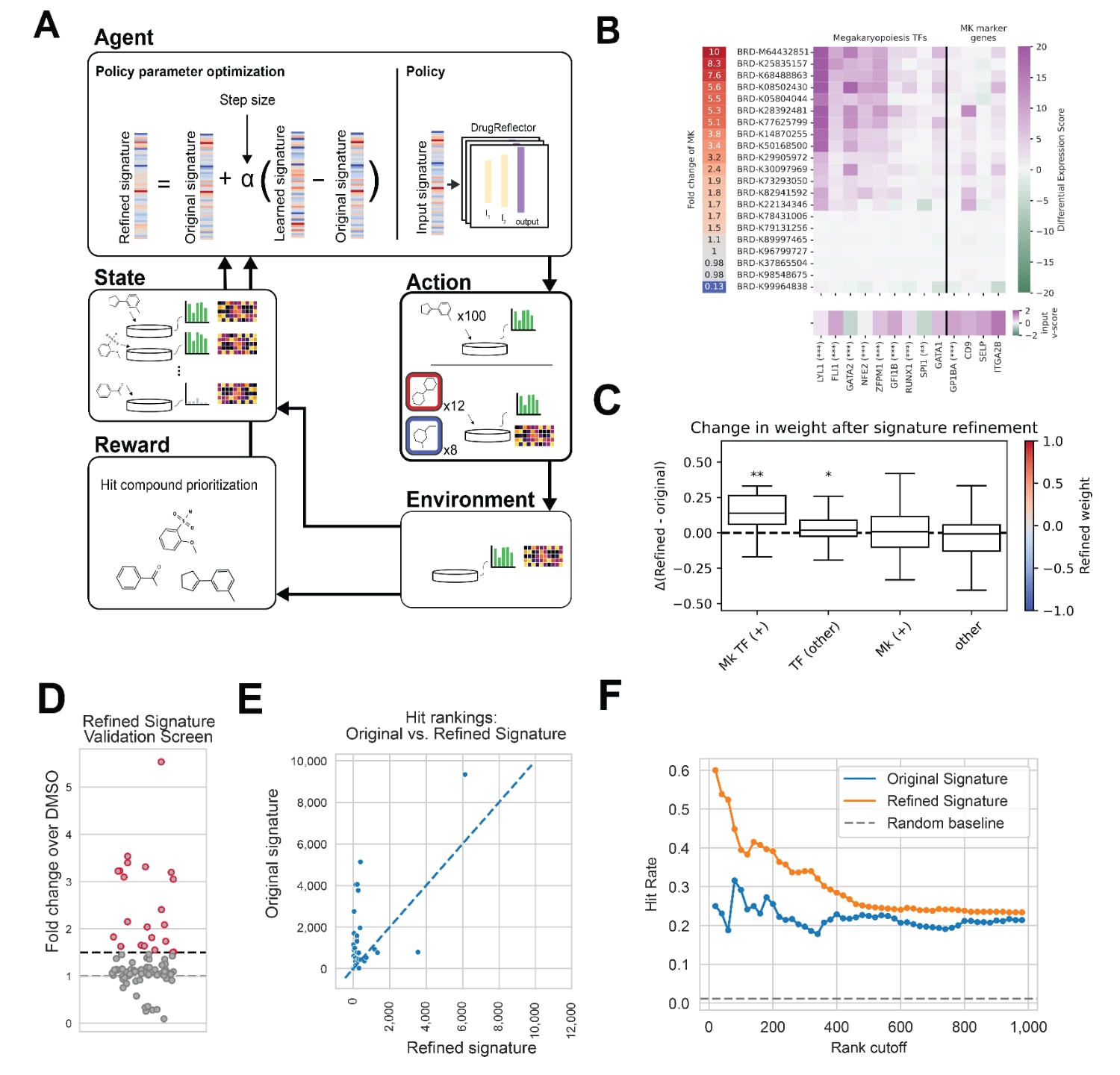 图4 | 展示了利用配对的转录组与表型读出进行主动特征模式学习,提升表型命中率。 (A)用于主动特征模式学习的强化学习框架示意图。在强化学习(RL)中,智能体采取行动与环境交互,环境产生奖励并引起状态变化,这些信息回馈用于更新策略,目标是学习到使奖励最大化的策略。在主动特征模式学习中,智能体由策略(即在给定输入表达特征模式时,DrugReflector输出的化合物排序)以及策略更新过程共同组成。行动是从DrugReflector中选择排名靠前的化合物进行表型筛选,并对信息量最大的化合物进行表型与转录组的配对测量,其中信息量最大的化合物指排名较高且在命中与未命中之间保持平衡的一组化合物。奖励对应于命中化合物被更靠前地优先排序,状态对应于配对的表型与转录组测量结果。智能体利用表型筛选得到的命中化合物及其配对数据学习更新后的表达特征模式,以最大化对命中化合物的优先排序。(B)热图展示24小时条件下,各化合物扰动后与Mk分化相关基因的差异表达。左侧为配对表型检测中观测到的Mk变化,下方显示原始预测中各基因的输入v-score。星号表示各基因与Mk倍数变化相关性的显著性,以Pearson相关检验测得。(C)箱线图展示特征模式精炼在不同基因类别上的变化幅度:诱导巨核生成的转录因子(MKTF(+)),其他转录因子(TF(other)),巨核标记基因(MK(+)),以及其余基因(other)。星号表示相对other基因集合的显著性,基于1000次随机抽取每次100个基因的子样本进行Mann-WhitneyU检验,并对
