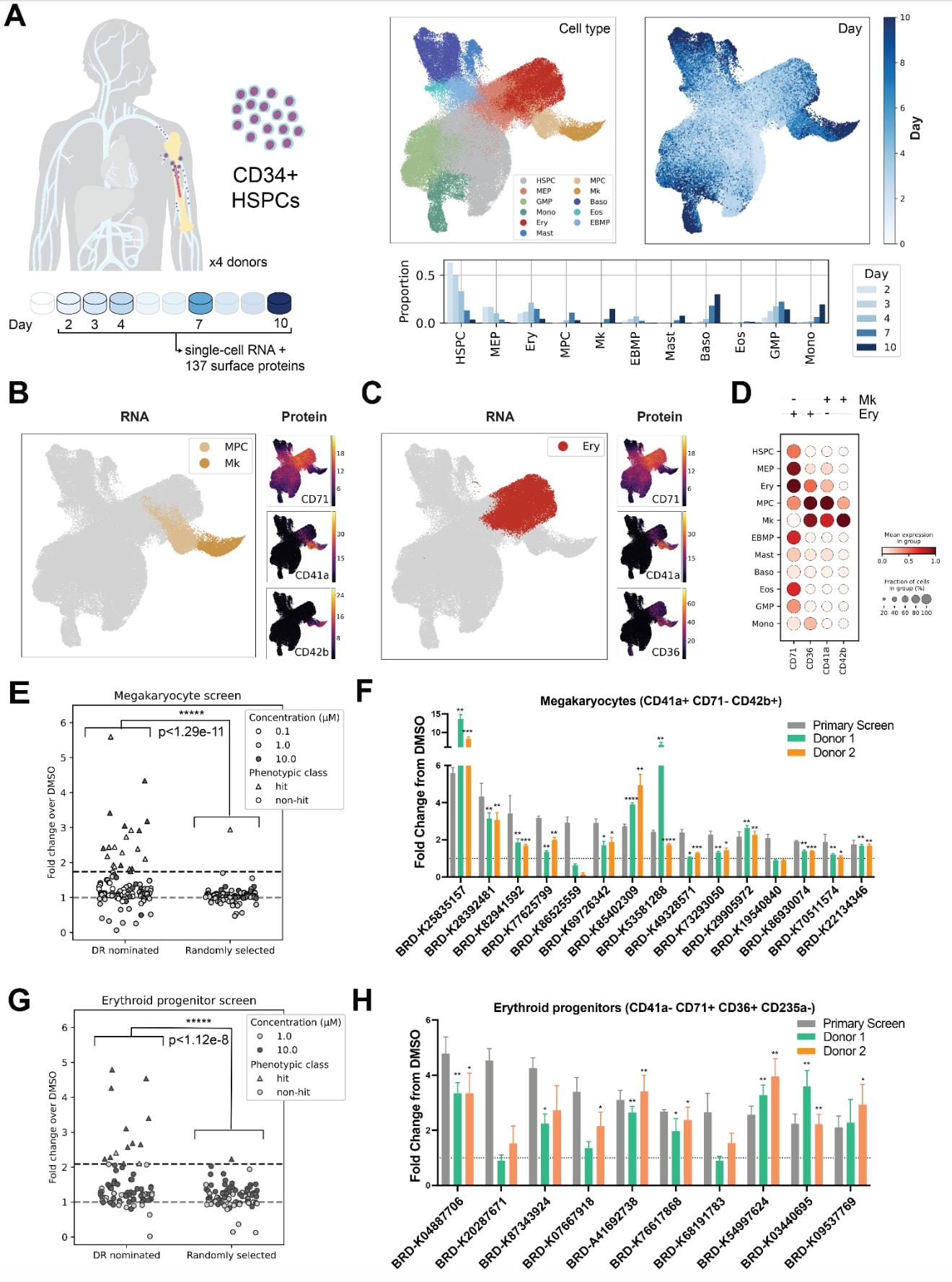 图3 | 展示了单细胞多组学引导的表型检测体系,用于在人体原代细胞中捕捉多谱系造血分化。 (A)从4名健康供体获取原代CD34+造血干祖细胞(HSPC),在体外10天时间序列内设置5个时间点进行CITE-seq(单细胞RNA-seq+抗体衍生标签的细胞表面蛋白标记测量)。图中展示来自所有供体与所有时间点的全部细胞的UMAP嵌入,下方给出各天各细胞类型的比例。(B与C)基于RNA计算的UMAP嵌入。较大的图分别展示与Mk谱系(B)或Ery谱系(C)相关的细胞类型,较小的图展示用于通过FACS对细胞群体进行阴性或阳性识别的表面标记物表达。(D)每个流式细胞术表型检测所使用的标记物面板,以及基于CITE-seq表面标记测量得到的各细胞类型中各表面标记物的平均表达。(E)实验验证诱导Mk分化的化合物结果,通过流式细胞术测量在体外分化7天且持续加入各化合物条件下的Mk诱导效果。三角形表示命中,圆形表示未命中。颜色表示化合物在何种剂量下对Mk丰度的诱导最强。灰色虚线表示相对DMSO的倍数变化为1(无变化)。黑色虚线表示Mk命中的显著性截断阈值。星号与