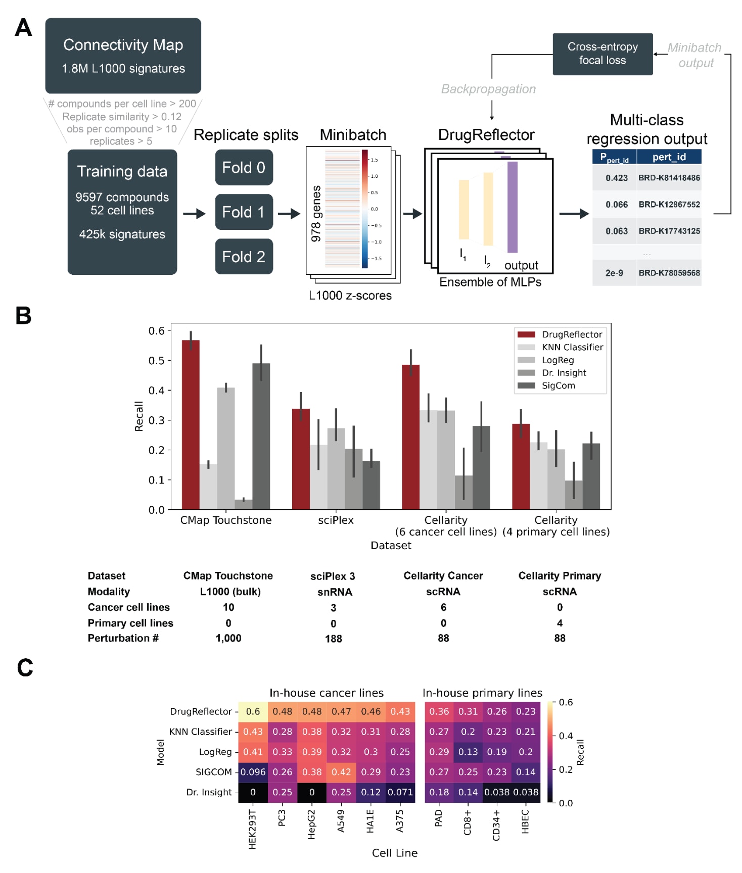 图2 | 展示了用于表型虚拟筛选的深度学习方法。 (A)模型训练流程示意图。对完整的CMAP数据集采用定制质量控制指标(方法部分)进行过滤,并按重复样本均分划分为训练用的折叠集合。集成模型中的每个子模型使用3折中的2折进行训练,并在留出的部分上验证。模型以多类别回归任务进行训练,目标是将正确的扰动标签匹配到输入的CMAP表达特征模式批次;这些输入为每块实验板内差异表达的z-score表征(Level4特征模式)。模型训练细节见方法部分。(B)各算法在各基准数据集上的性能,以跨所有细胞系的平均前1%化合物召回衡量。误差棒表示跨细胞系的标准差。snRNA:单核RNA-seq;scRNA:单细胞RNA-seq。(C)内部扰动转录组筛选数据中,各算法在每个细胞系上的召回热图,该数据包含6个肿瘤细胞系与4个原代细胞系。