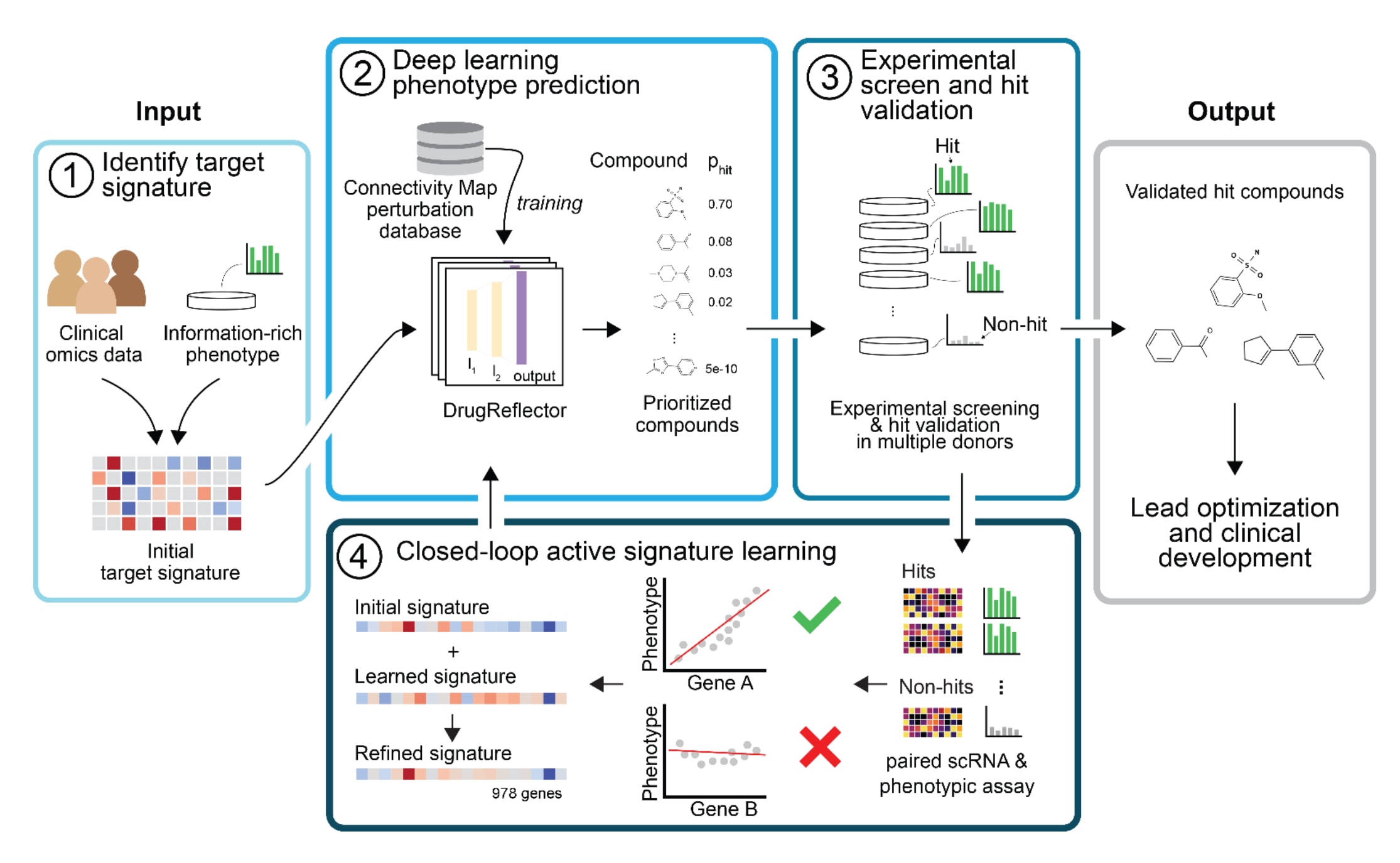 图1 | 展示了DrugReflector模块化且具备泛化能力,借助组学层面的深度学习模型实现表型药物发现。 (1)首先,基于临床数据,和/或来自信息量丰富且具有临床可转化性的表型检测体系的数据,确定目标表达特征模式(此处为来源于单细胞RNA-seq数据的转录组表达特征模式)。(2)为确定进入筛选的化合物,在扰动表达特征模式上训练的深度学习模型DrugReflector(此处使用LINCSConnectivityMap)预测哪些化合物更可能诱导目标表达特征模式。(3)随后对化合物进行实验筛选,识别能够诱导期望表型的命中化合物,并在多个供体中完成验证。通过验证的命中化合物构成该发现阶段的输出,并可用于后续临床前开发。(4)通过实验室参与的闭环流程,利用组学与表型的配对测量对输入表达特征模式进行主动精炼,从而提升对活性化合物的优先排序效果。