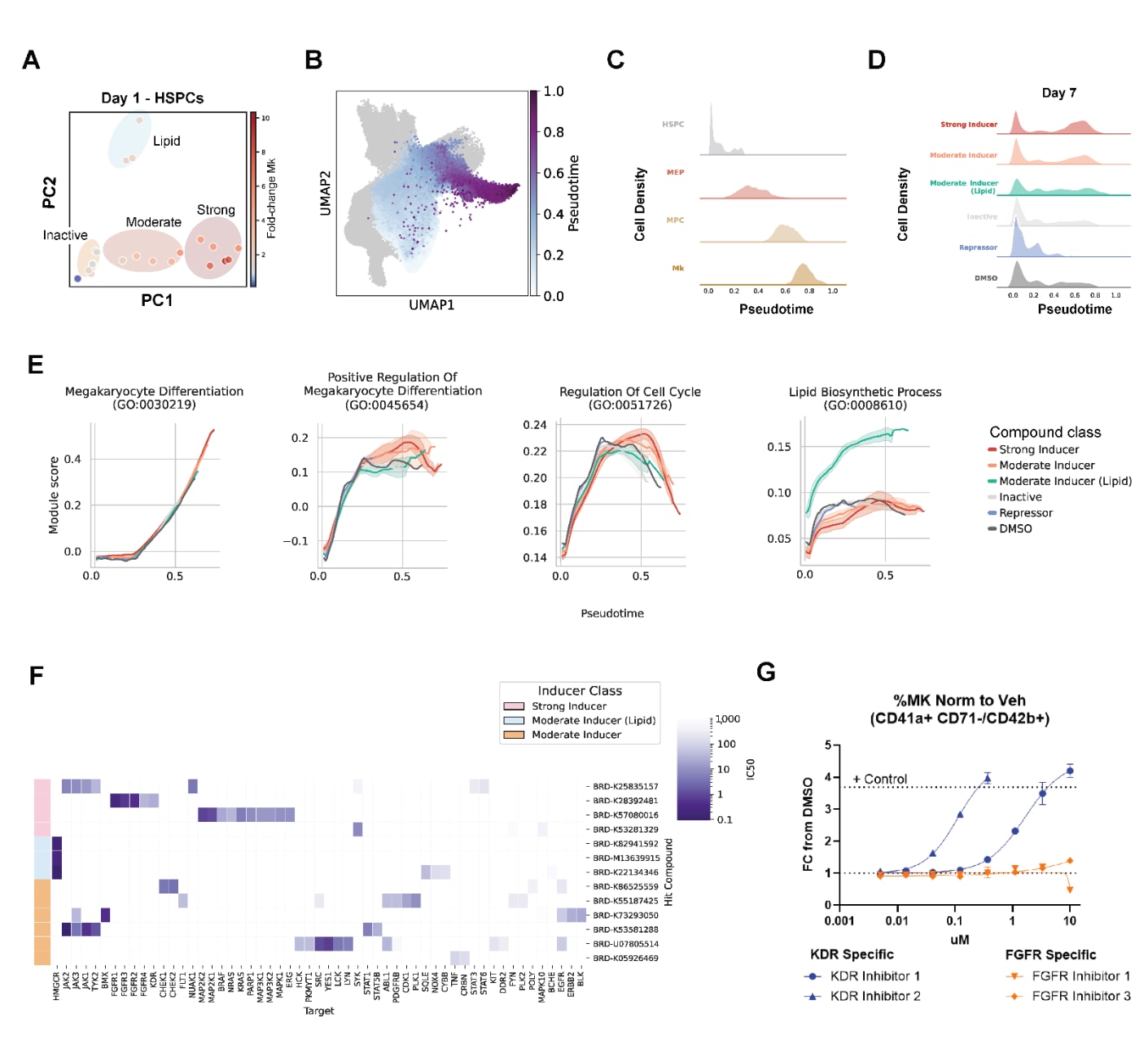 图5 | 展示了解释化合物诱导巨核生成的作用机制。 (A)对预测的Mk诱导化合物在24小时HSPC中相对于DMSO得到的差异表达特征模式进行主成分分析。PC空间中的化合物按相对DMSO的Mk倍数变化着色。(B)在HSPC、MEP、MPC与Mk细胞上计算扩散拟时序,并展示其UMAP嵌入。(C)脊形图展示不同拟时序阶段中各细胞类型的细胞密度分布。(D)按化合物类别统计第7天细胞密度。(E)在拟时序上,按化合物类别展示与GO生物过程相关基因的滚动窗口平均表达。误差带表示同一类别化合物处理细胞间表达的标准差。(F)来自ChEMBL的巨核生成诱导化合物靶点抑制IC50。命中化合物按(A)中注释的诱导类别分组。热图颜色表示对数尺度下的IC50。(G)对KDR(蓝)与FGFR(黄)具有选择性结合亲和力的化合物剂量反应曲线。