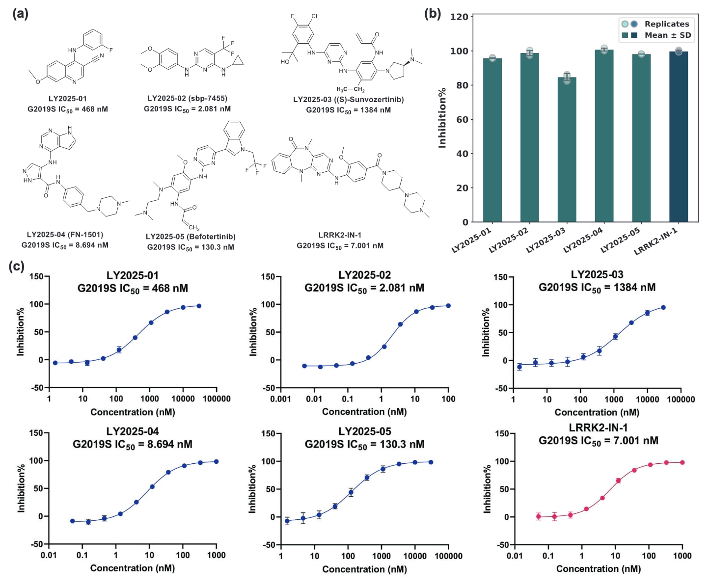如图6a所示,五个候选化合物在拓扑结构上十分多样,其核心骨架与取代基存在明显差异。值得注意的是,LY2025-04(FN-1501)在10 μM时表现出100%的抑制率,略高于阳性对照LRRK2-IN-1的99.72%(图6b)。后续的生化实验进一步验证LY2025-04具有接近LRRK2-IN-1的高效活性,IC50分别为8.694 nM与7.001 nM(图6c)。另外,LY2025-01、LY2025-02与LY2025-05在10 μM时的抑制率均超过90%。其中LY2025-01此前未被报道为激酶抑制剂,其IC50达468 nM,表现出良好活性并显示其作为G2019S突变LRRK2功能调节剂的潜在价值。LY2025-02(sbp-7455)此前报道可抑制ULK1/2,而其对LRRK2 G2019S的IC50为2.081 nM,甚至优于参考抑制剂LRRK2-IN-1,显示出更高的靶点选择性与结构兼容性。LY2025-05(Befotertinib)是一种已获批用于非小细胞肺癌的药物,其对G2019S突变体的IC50为130.3 nM,展现出在帕金森病及其他LRRK2突变相关疾病中的再利用潜力。LY2025-03(IC50为1384 nM)虽然活性较弱,但仍可作为进一步优化的起点。