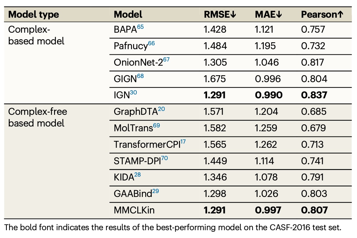 除了在保守的激酶结构上评估MMCLKin的预测性能外,还系统考察了其在十个结构多样的蛋白质数据集上的泛化能力。这些数据集包括PDBbind(PDBbind v2020与CASF-2016)、七个靶点超家族以及IDG-DREAM Drug–Kinase Binding Prediction Challenge中的两类激酶数据集。对于PDBbind数据集,以CASF-2016基准集作为测试集,并将所有与CASF-2016重叠的复合物从PDBbind v2020的general与refined集合中剔除以避免数据泄漏。随后从refined集合中随机选取500个样本作为验证集,其余样本与general集合合并组成训练集。需要指出的是,尽管MMCLKin并不依赖实验复合物结构,该研究仍将其与依赖复合物结构的模型及非结构依赖模型进行比较,以实现更全面的评估,相关对比模型的实验结果来自已发表文献。