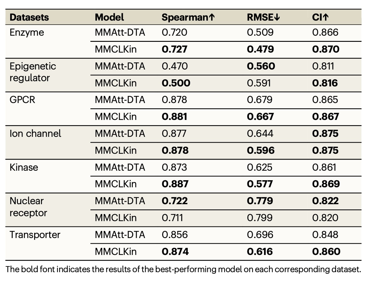 表2|展示了MMCLKin与MMAtt-DTA在七个靶点超家族上的性能对比。