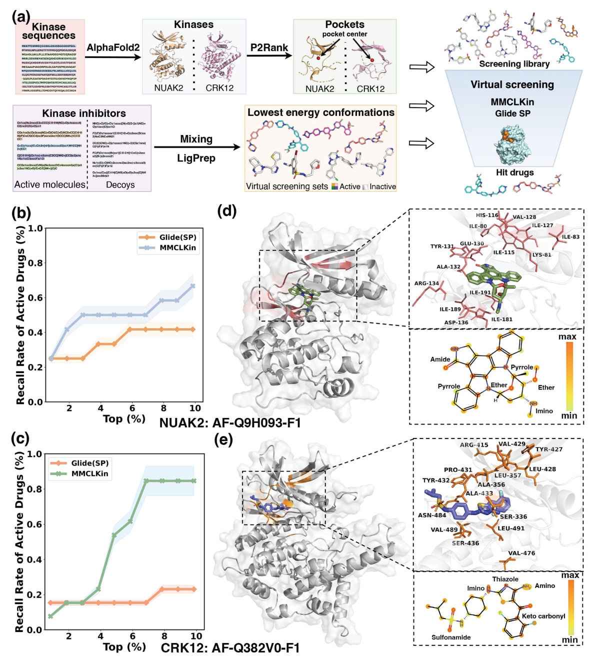 图5|展示了MMCLKin在无实验解析结构的NUAK2与CRK12激酶靶点上的虚拟筛选性能与可解释性分析。 部分a显示了MMCLKin与Glide SP在NUAK2与CRK12上的虚拟筛选流程。部分b比较了两种方法在NUAK2活性分子召回率方面的表现。部分c展示了它们在CRK12上的活性分子召回率对比。部分d展示了MMCLKin在NUAK2复合体系中识别的关键残基与功能基团。部分e展示了MMCLKin在CRK12复合体系中识别的关键残基与功能基团。为增强结构展示的直观性,两个复合物均通过Glide SP生成。源数据已作为Source Data文件提供。