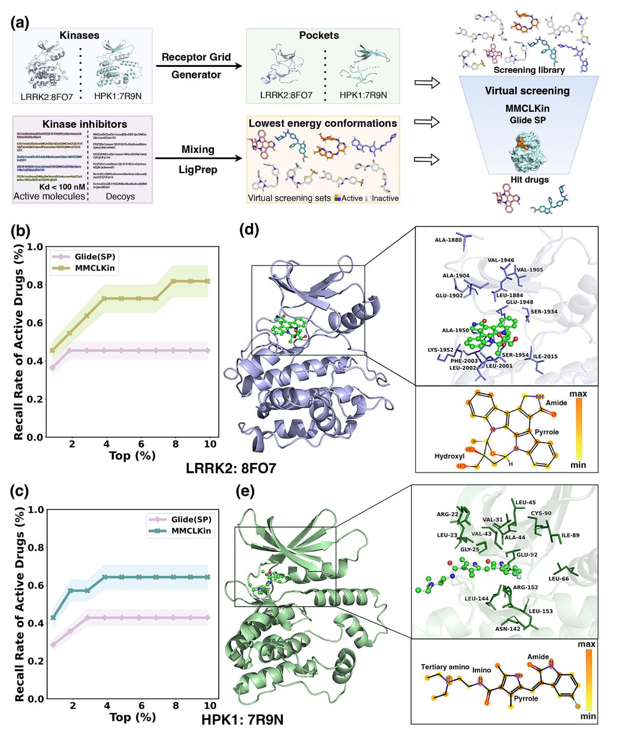 图4|展示了MMCLKin在具有实验结构的两个激酶靶点LRRK2与HPK1上的虚拟筛选表现与可解释性分析。 部分a显示了MMCLKin与Glide SP在LRRK2与HPK1上的虚拟筛选流程。部分b比较了两种方法在LRRK2(PDB ID: 8FO7)活性分子召回率方面的表现。部分c展示了它们在HPK1(PDB ID: 7R9N)上的活性分子召回率对比。部分d展示了MMCLKin在8FO7-BDBM50308060复合体系中识别的关键残基与功能基团。部分e展示了MMCLKin在7R9N-BDBM4814复合体系中识别的关键残基与功能基团。为增强结构展示的直观性,两个复合物均通过Glide SP生成。源数据已作为Source Data文件提供。