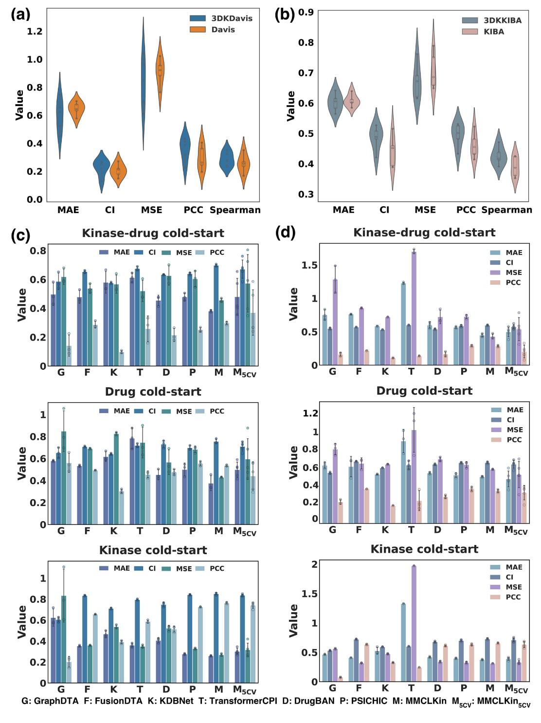首先利用仅包含激酶序列与药物SMILES的原始Davis与KIBA数据集,通过序列模型ConPLex对比评估构建的3DKDavis与3DKKIBA数据集的实用性与质量。ConPLex基于预训练蛋白语言模型ProtBert对蛋白序列进行编码,并使用分子指纹表示药物,随后通过protein-anchor对比共嵌入策略将蛋白与药物映射至共享潜在空间,从而区分真实互作与非互作样本。图2a与2b展示了ConPLex在四个数据集上采用激酶–药物冷启动划分进行五次独立运行后的结果分布。结果显示,与原始数据集相比,ConPLex在3DKKIBA与3DKDavis上的五个指标均得到提升,尤其是在CI、PCC与Spearman系数上的显著改善,说明构建的数据集能够帮助模型更好捕获激酶–抑制剂的关键互作信息。