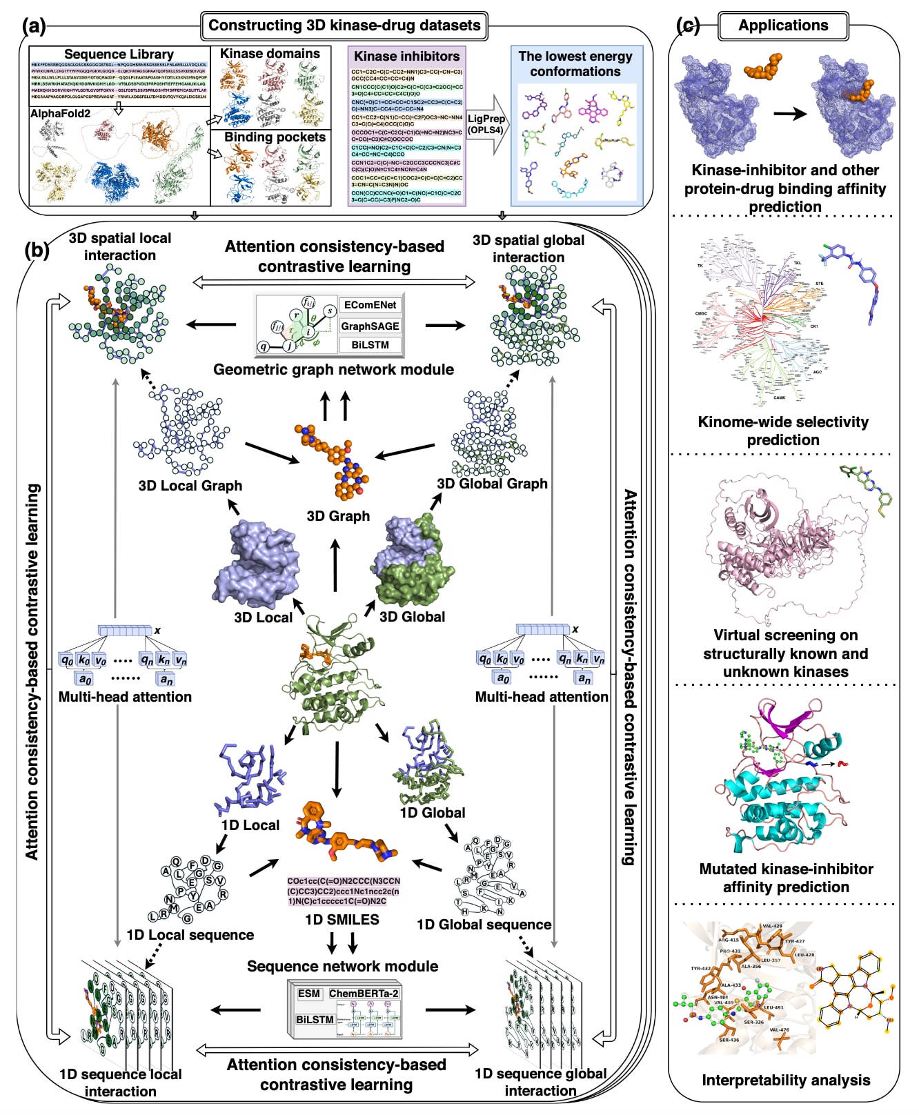 由于激酶结构高度保守,高效且高选择性的激酶抑制剂发现依然是当前生物医学研究中极具挑战性的任务。全激酶组实验测定的高成本进一步凸显了发展高精度预测方法以评估激酶–抑制剂结合亲和力与选择性的迫切性。该研究提出了MMCLKin框架,用于预测不同激酶上的抑制剂活性与选择性。该框架利用几何图网络捕获空间结构特征,通过基于大语言模型的序列网络提取进化与化学信息,并采用多头注意力机制建模复杂的激酶–药物互作,同时量化系统中各要素对预测任务的贡献。此外,提出的多模态与多尺度注意力一致性对比学习方法能够有效整合多类互作特征。