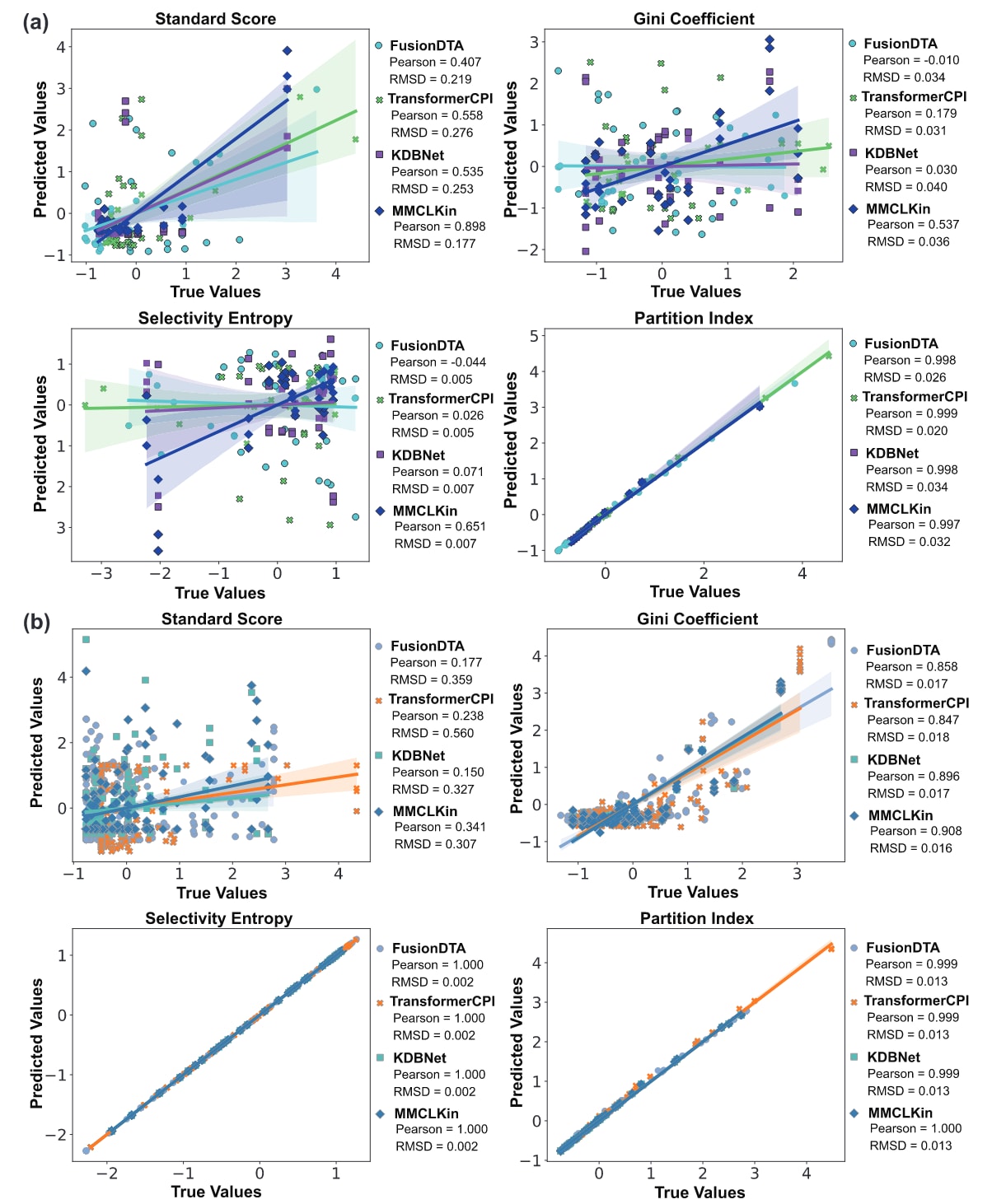 图3|展示了MMCLKin在全激酶组范围内的激酶抑制剂选择性预测表现。 部分a比较了MMCLKin与其他多种模型在3DKDavis数据集上的选择性预测性能(n=39),部分b则比较了在低药物相似度的LSKIBA数据集上的表现(n=156)。Pearson用于衡量每项指标中预测选择性分布与实验选择性分布之间的线性相关性,RMSD用于评估二者整体偏差程度。图中的阴影区域表示95%置信区间。源数据已作为Source Data文件提供。
