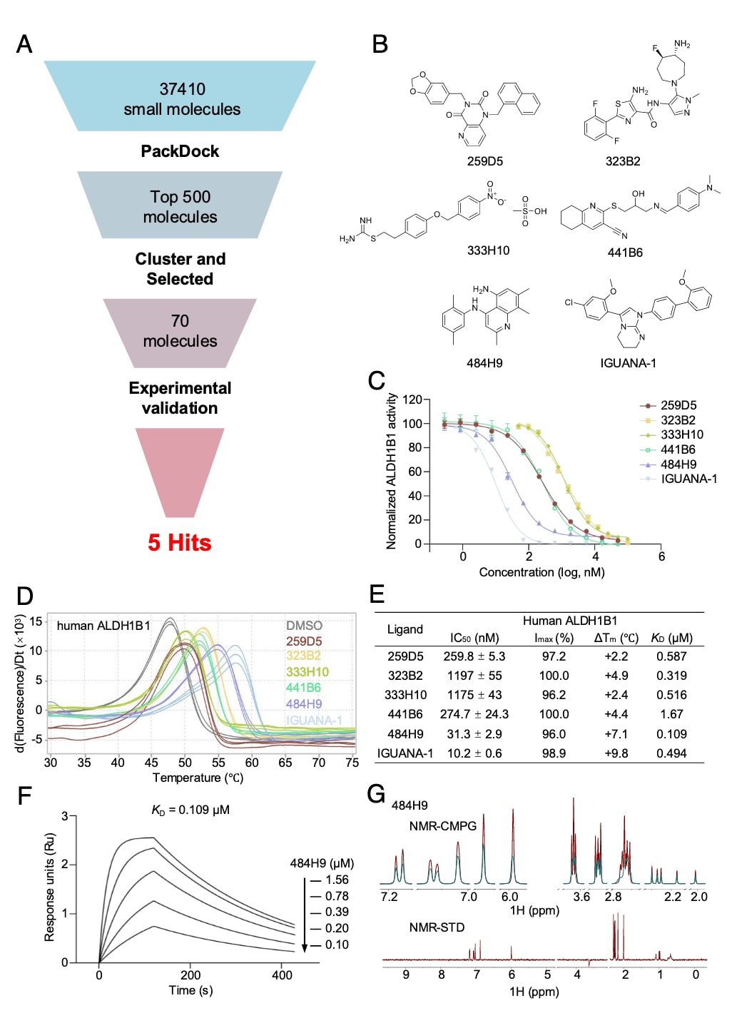 为评估PackPocket在真实药物发现中的应用潜力,相关研究围绕醛脱氢酶1B1(ALDH1B1)开展了前瞻性实验。ALDH1B1参与醛类代谢,研究显示其在结直肠癌与胰腺癌等多种肿瘤中呈高表达并发挥重要作用,且选择性抑制ALDH1B1可显著抑制结直肠癌球体与患者来源类器官的生长。目前已报道的ALDH1B1抑制剂类型较少,且均处于临床前研究阶段,因此发现靶向ALDH1B1的新型小分子抑制剂具有必要性。实验首先采用酶动力学测定评价候选化合物对ALDH1B1的抑制活性,并以IGUANA-1作为阳性对照;完整的虚拟筛选流程(包括化合物聚类标准与化合物库信息)见附录S3。ALDH1B1的表达与纯化、酶活实验、蛋白热转移(PTS)实验、表面等离子共振(SPR)实验以及NMR实验的详细方案见附录S19。最终筛得5个命中化合物,命中率为7.14%(图4A、图4B及附录S20与表S7)。这些化合物对ALDH1B1表现出显著抑制活性(图4C、图4E),并能明显提高重组ALDH1B1蛋白的热稳定性(图4D)。补充实验结果还包括命中化合物的SPR亲和力曲线(附录图S19)、对ALDH1B1及对照同工酶的抑制曲线(附录图S20)、筛选的70个化合物抑制率统计(附录图S21)、刚性对接与PackDock下命中化合物的打分与排序对比(附录表S7),以及晶体配体姿态(7mjd)与PackDock预测的484H9姿态对比(附录图S22)。实验结果表明,这5个化合物在ALDH家族内具有选择性,在所测试的多个蛋白中仅对ALDH1B1呈现显著抑制效应。SPR结果显示,这5个化合物的结合亲和力分布在0.109至1.67μM范围内(图4E、图4F及附录图S19)。此外,对其中活性最高的化合物484H9,进一步使用NMR验证其与ALDH1B1的结合,在与重组ALDH1B1孵育后观察到484H9信号衰减(图4G),并在STD谱中检测到正的STD信号,这些结果共同证实了484H9与ALDH1B1之间的相互作用。