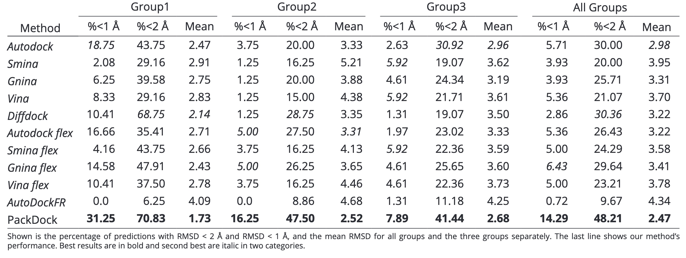 结果如图3A与图3B所示,PackDock在全部靶点上显著优于现有对接方法。表1进一步汇总了不同分组的配体平均RMSD,以及RMSD<