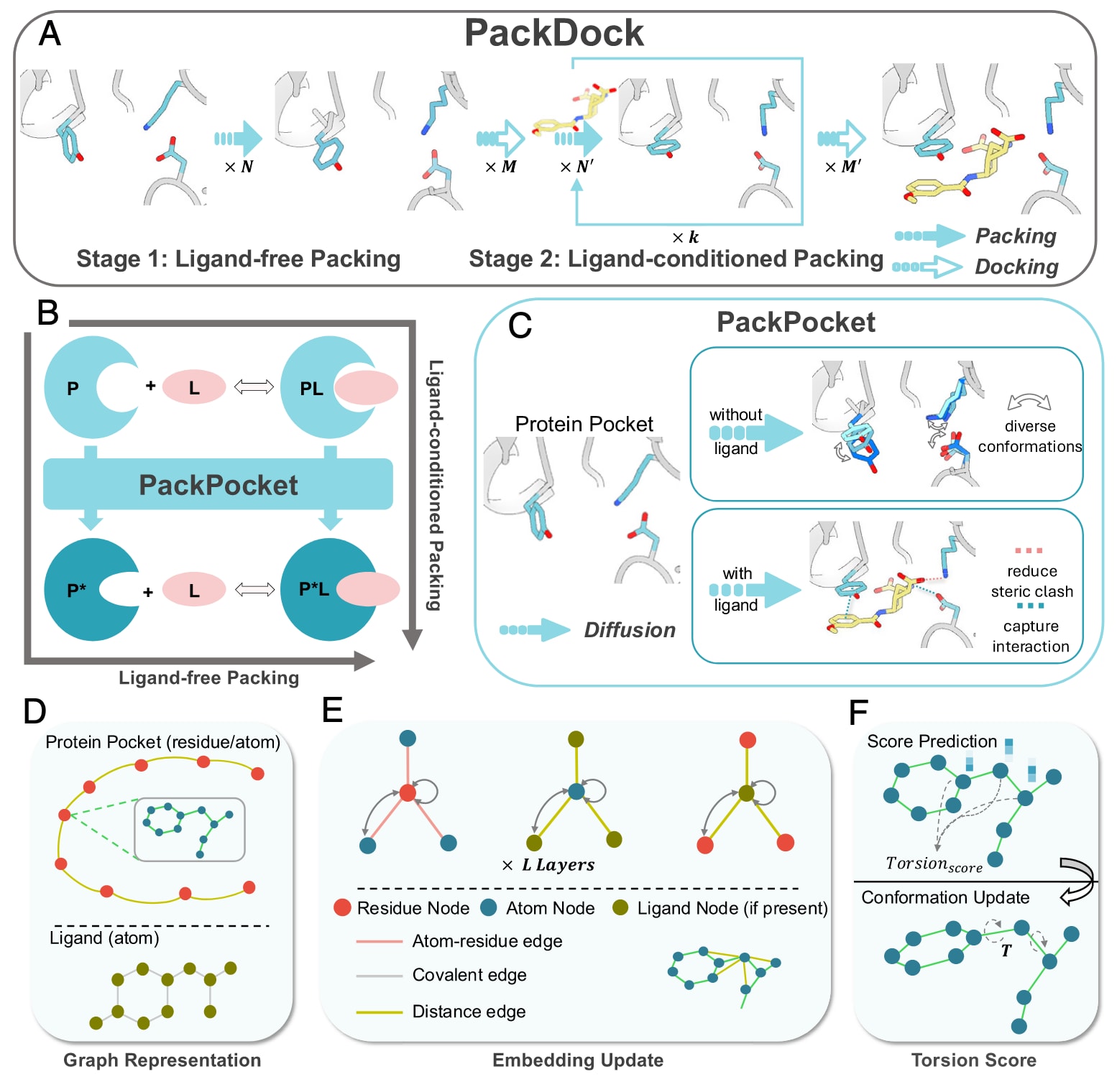 图1 | 展示了PackDock的整体流程与PackPocket模块的关键组成。(A)PackDock以两阶段运行。第一阶段使用扩散模型PackPocket探索空口袋的侧链构象,以覆盖多样的受体口袋形态。第二阶段将第一阶段获得的多样口袋构象作为受体用于对接,并利用对接后配体的构象来建模配体在结合过程中对口袋构象的影响,最终得到能够反映结合过程动态变化的受体-配体复合物构象集合。(B)PackPocket既可以在无配体条件下考虑侧链构象空间,也可以在配体存在时刻画结合态的侧链构象空间。(C)PackPocket模块的扩散去噪过程示意,该过程既可在给定配体的条件下执行,也可在不提供配体时执行。(D)口袋区域的原子图与配体图表示:口袋区域的原子图由残基节点构成,每个残基节点包含该残基对应的原子节点;当存在配体时,配体原子也作为节点纳入图结构。(E)嵌入更新过程:残基节点的信息由其对应残基的原子节点进行更新;配体原子节点的信息作为输入,用于更新相应的残基节点与原子节点。其中橙色边表示原子与其所属残基之间的连接,灰色边表示共价连接,绿色边表示基于距离的连接。(F)扭转角score:score模型在原子级嵌入表示的基础上更新侧链的扭转构象,从而逐步得到合理的侧链排布。