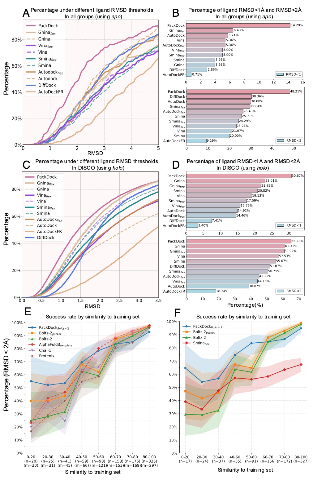 如图3C所示,不同RMSD阈值下配体姿态所占比例被可视化,PackDock对应曲线整体高于其他方法。进一步按不同RMSD阈值统计对接成功率,结果见图3D与附录表S5:当要求RMSD<