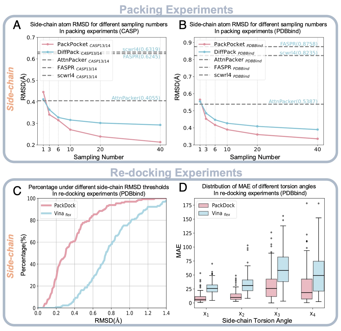 图2 | 展示了不同基准数据集上的侧链堆积与重对接结果,用于评估采样规模与柔性对接效果之间的关系。 (A)在CASP数据集的堆积实验中,比较不同采样数量下侧链原子RMSD的变化趋势,虚线表示采样数为1时方法的性能作为参照。(B)在PDBBind数据集的堆积实验中同样考察不同采样数量下的侧链原子RMSD,用于对比不同数据分布下采样对恢复精度的影响。(C)在重对接实验中,统计柔性对接方法在不同侧链RMSD阈值下的比例,以刻画在不同精度要求下方法能够达到的覆盖水平。(D)对接过程中由PackDock与Vinaflex生成的侧链扭转角