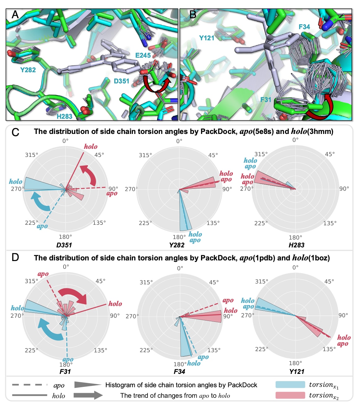 图5 | 展示了代表性apo-holo体系展示了PackDock对关键残基构象变化与构象分布趋势的刻画能力。 (A)在apo(5e8s,绿色)-holo(3hmm,青色)体系中,D351表现出显著的构象变化。(B)在apo(1pdb,绿色)-holo(1boz,青色)体系中,F31表现出显著的构象变化,而其他构象差异较小的氨基酸则呈现紧凑的单峰分布。(C)统计了PackDock在apo(5e8s)-holo(3hmm)体系中生成的D351、Y282与H283侧链扭转角分布。(D)统计了PackDock在apo(1pdb)-holo(1boz)体系中生成的F31、F34与Y121侧链扭转角分布。