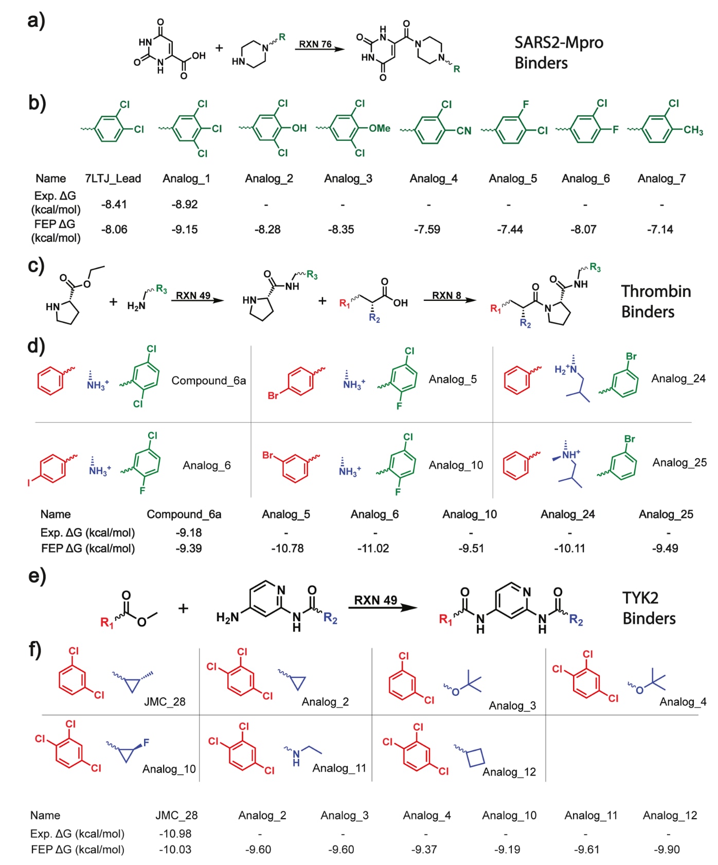 由于SynLlama会将用于合成的原始目标分子拆解为构建块,因此该方法天然支持围绕分子骨架的局部片段进行多样化探索,而不仅仅是对完整目标分子进行整体改造。在最后一项任务中,该方法被用于上一节涉及的三个蛋白靶点的命中分子扩展:SARS2 MPro、Thrombin与TYK2,目标是发现既可合成、又具有更优相对结合自由能(RBFE)的分子,并且该提升能够同时得到实验与高精度自由能微扰(FEP)计算的支持。