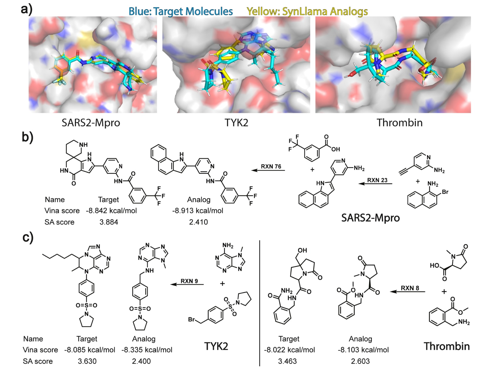 图3 | 展示了使用iMiner为SARS2 MPro生成分子并由SynLlama给出可合成类似物的示例,以及使用Pocket2Mol为TYK2与Thrombin生成分子并由SynLlama给出可合成类似物的示例。 (a)三个蛋白靶点的对接构象可视化结果。(b)SARS2 MPro中,iMiner生成的目标分子与SynLlama提出的类似物的对接评分与SA评分,并同时给出预测的合成路径。(c)TYK2与Thrombin中,Pocket2Mol生成的目标分子与SynLlama提出的类似物的对接评分与SA评分,并同时给出各自预测的合成路径。