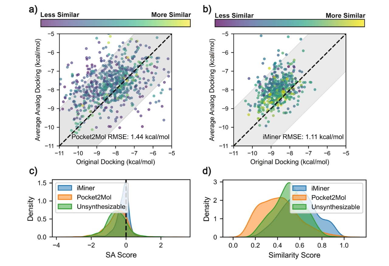 图2 | 展示了SynLlama在为Pocket2Mol与iMiner提出的SARS2 MPro、Thrombin与TYK2结合物生成可合成类似物方面的表现。 对比散点图,用于比较(a)Pocket2Mol与(b)iMiner生成分子的对接评分,以及基于RXN2训练的SynLlama为每个分子提出的10个最相似类似物的平均Vina对接评分。每个数据点按生成分子与其类似物之间的平均Morgan指纹相似度进行颜色编码。阴影区域表示对接能量不确定性范围为±2kcal/mol。(c)Pocket2Mol、iMiner生成的不可合成分子与SynLlama提出的类似物之间,合成可及性(SA)评分差值的分布。使用RXN1训练的SynLlama为iMiner生成的类似物得到的结果与补充图S6所示相近。补充图S7中的核密度结果进一步支持这一发现,即这些类似物在不削弱整体对接评分分布的前提下,会稳定地向更优的SA方向移动。(d)目标分子与其前10个候选类似物之间的平均Morgan指纹相似度分数。