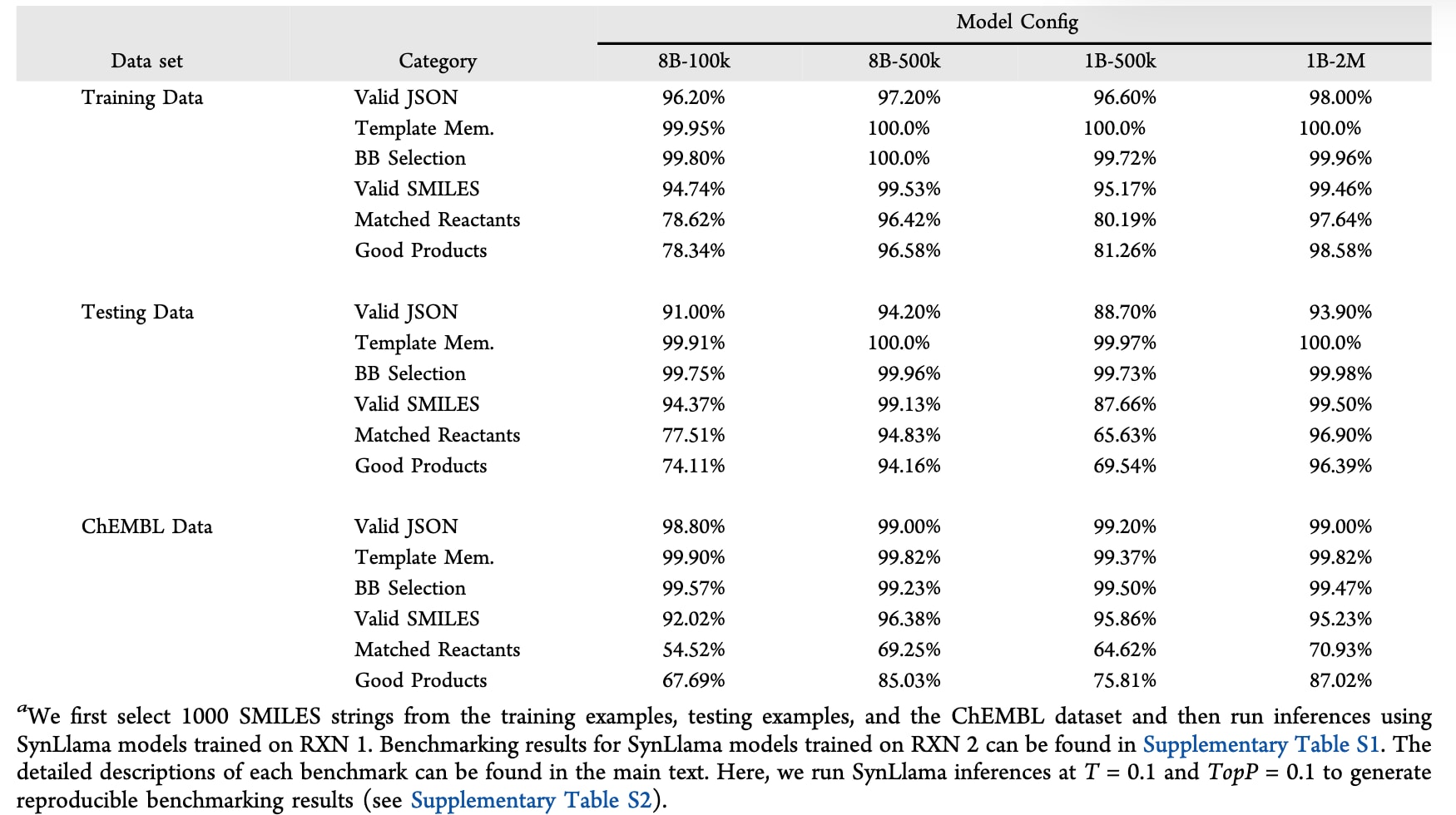 该方法在不同数据规模上对Llama-3.1-8B(80亿参数)与Llama-3.2-1B(10亿参数)进行SFT。具体而言,Llama-3.1-8B分别使用包含100k与500k条合成路线的数据集进行微调,对应需要40与240个A40-GPU小时。Llama-3.2-1B则使用包含500k与200万条合成条目的数据集进行训练,分别需要约60与240个A40-GPU小时。在结果部分的前半部分,训练后的模型以SynLlama(参数规模)(训练反应数量)的方式命名,例如SynLlama-1B-2M表示在Llama-3.2-1B基础上,用200万条合成路线微调得到的模型。关于SFT的更多细节同样在Supporting Information中提供。