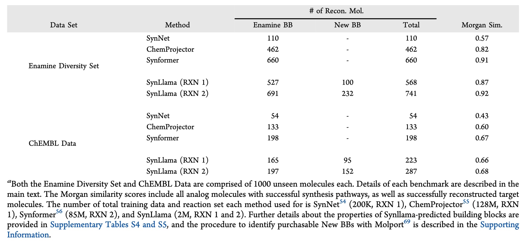 不过,与只能使用Enamine构建块生成分子的baseline方法不同,SynLlama由于具备生成式能力,即便未针对这一点进行专门训练,仍额外具备使用超出Enamine范围的商业可得构建块来重构目标分子的能力。如表2所示,New BBs一列将新增构建块限制为可通过Molport购买的条目,它们为所有数据集与反应模板补充了更多可能的合成路径,从而提升目标分子的重构可能性。这一机制同样有助于ChEMBL数据,因为使用新构建块生成的分子仍保持药物样特征,见补充图S5。由于部分目标分子可能存在多条可行路径,既可仅用Enamine构建块合成,也可结合New BBs实现,因此表2中的Total列统计的是SynLlama能够重构出的不重复目标分子数量。在引入New BBs后,SynLlama的最佳重构率提升至:对Enamine Diversity Set中的1000个分子达到74.1%,对ChEMBL数据则提升到28.7%。这些结果说明SynLlama对反应化学的学习使其能够预测新颖构建块,从而提高合成可及性。