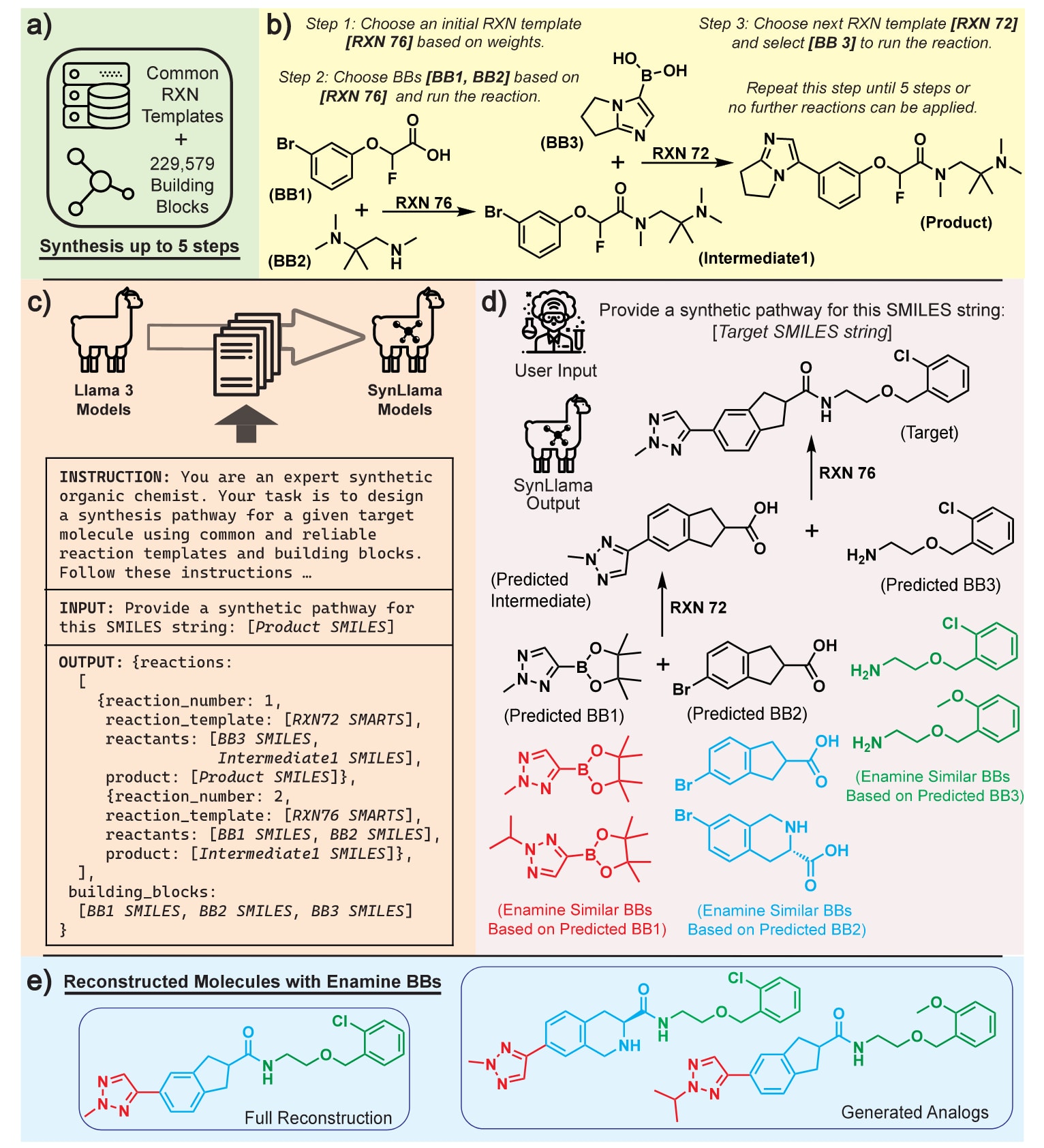 图1 | 展示了SynLlama工作流程概览,包括数据生成、有监督微调、推理与重构。 (a)由反应模板(RXN)与构建块(BB)组成的预定义可合成化学空间可覆盖数十亿级别的分子。(b)展示一个合成数据样例及其生成过程,从已定义的可合成化学空间中构造训练样本,其中RXN76表示酰胺偶联,RXN72表示Suzuki偶联。(c)有监督微调的示意图,用于将Llama3基础模型转换为SynLlama模型,并给出与(b)中示例合成对应的指令、输入与输出格式。(d)SynLlama对未见过的测试分子进行推理。黑色部分表示SynLlama直接输出的逆合成结果,由RXN序列与预测的BB组成;带颜色的BB表示在Enamine构建块库中与预测BB最相似的前两个候选,其中RXN76表示酰胺偶联,RXN72表示Suzuki偶联。(e)利用预测的反应序列以及从Enamine构建块库中检索到的相似构建块进行分子重构。在该示例中,所有预测构建块均能在Enamine库中找到,因此既可完整重构输入分子,也可生成结构非常接近的类似物。