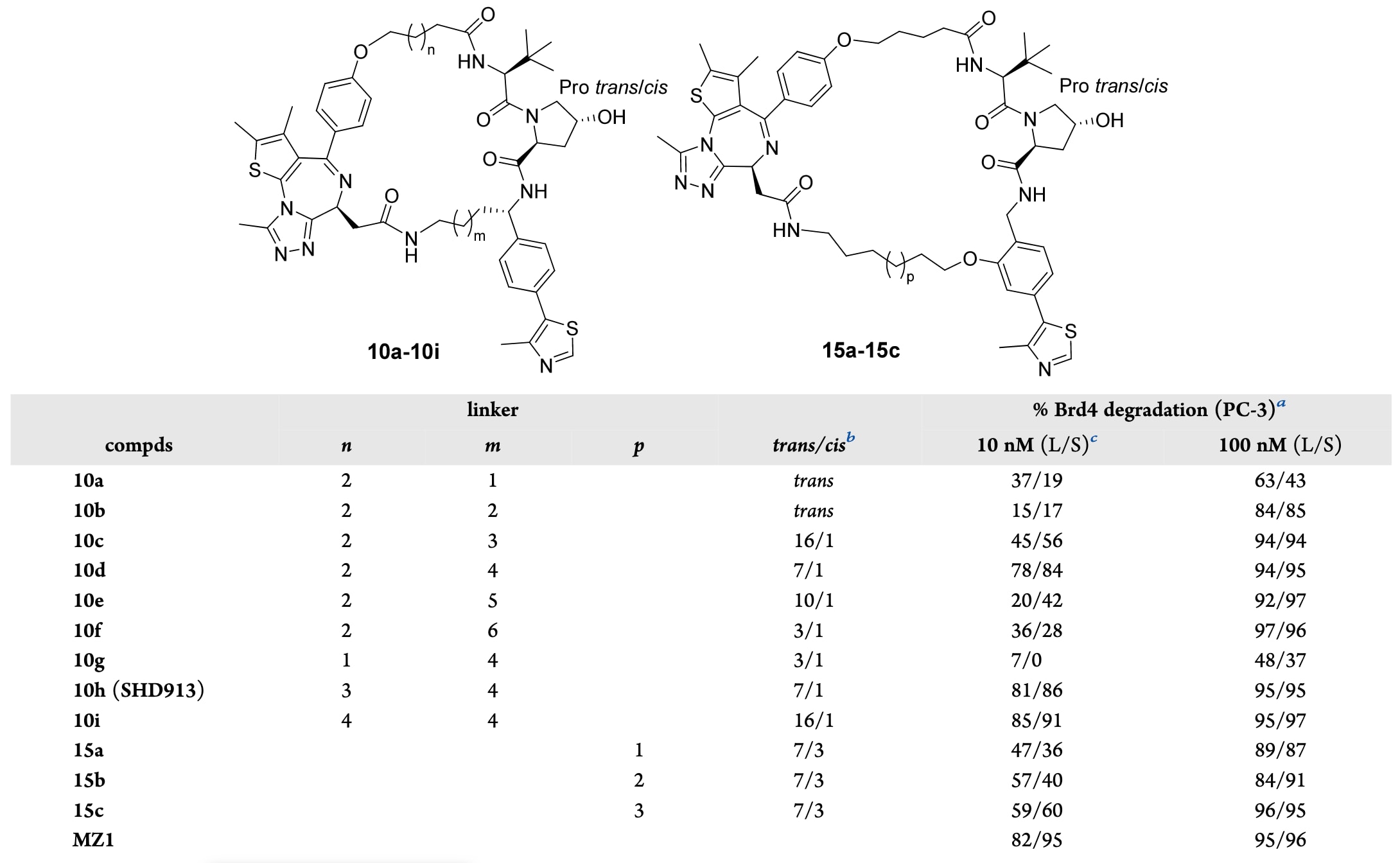 表1|化合物10a−10i和15a−15c的蛋白降解效率。