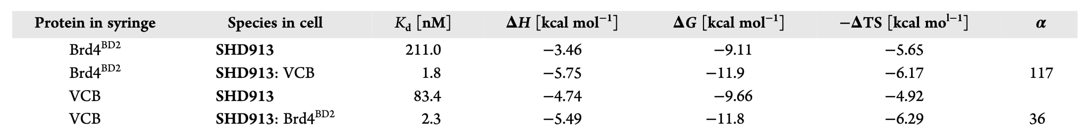 表2|通过等温滴定量热法(ITC)测定的SHD913、VHL−Elongin C−Elongin B(VCB)与Brd4BD2之间形成二元及三元复合物的热力学参数。