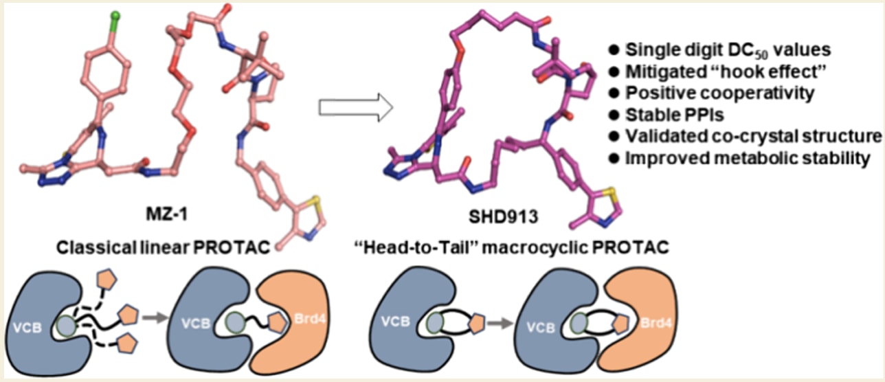大环化是传统药物设计中一种极具吸引力的策略,可用于提升生物活性、靶标特异性以及代谢稳定性,但由于PROTACs作用机制及结构复杂性,这一策略在PROTAC设计中很少被采用。该研究报道了首个“首尾相连”大环PROTACs系列的理性设计。其中代表性化合物SHD913在多种癌细胞系中表现出显著的Brd4蛋白降解能力,其DC50达到低nM水平,同时几乎完全消除了PROTACs中普遍存在且备受关注的“钩状效应”。进一步的生物学研究表明,该化合物具有正协同性,并在生物物理和细胞NanoBRET实验中诱导了新的蛋白-蛋白相互作用,其细胞活性优于已报道的首个大环Brd4 PROTAC macroPROTAC-1。体外肝微粒体稳定性评估显示,与线性对照分子相比,SHD913在不同物种中均具有更高的代谢稳定性。Brd4BD2:SHD913:VCB(VHL、Elongin C和Elongin B)三元复合物的共晶结构解析结合分子动力学模拟,揭示了化学诱导蛋白-蛋白相互作用的结构细节,并突出了SHD913构象受限特性在三元复合物形成中的关键作用。上述结果共同表明,大环化是一种具有吸引力且可行的全新PROTAC设计策略。