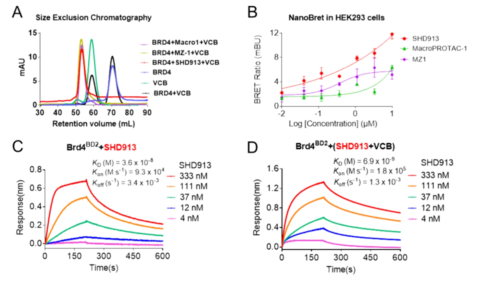 图4|SHD913诱导稳定的三元复合物形成并表现出正协同性。 (A)采用体积排阻色谱对不同组分进行分析,包括Brd4BD2(蓝色)、VCB(浅绿色)、Brd4BD2与VCB混合物(黑色),以及Brd4BD2与VCB在SHD913(红色)、MZ1(黄色)或macroPROTAC-1(紫色)存在下形成的复合物。(B)在HEK293细胞中通过NanoBRET实验验证三元复合物的形成情况,其中SHD913为红色,macroPROTAC-1为绿色,MZ1为紫色。(C)利用生物层干涉(BLI)实验测定SHD913与Brd4BD2形成二元复合物的Kd值,将生物素化Brd4BD2固定于传感器表面后,与不同浓度的SHD913孵育。(D)利用BLI实验测定SHD913:VCB:Brd4BD2三元复合物的Kd值,将生物素化Brd4BD2固定于传感器表面后,加入预先与VCB孵育的不同浓度SHD913进行测定。
