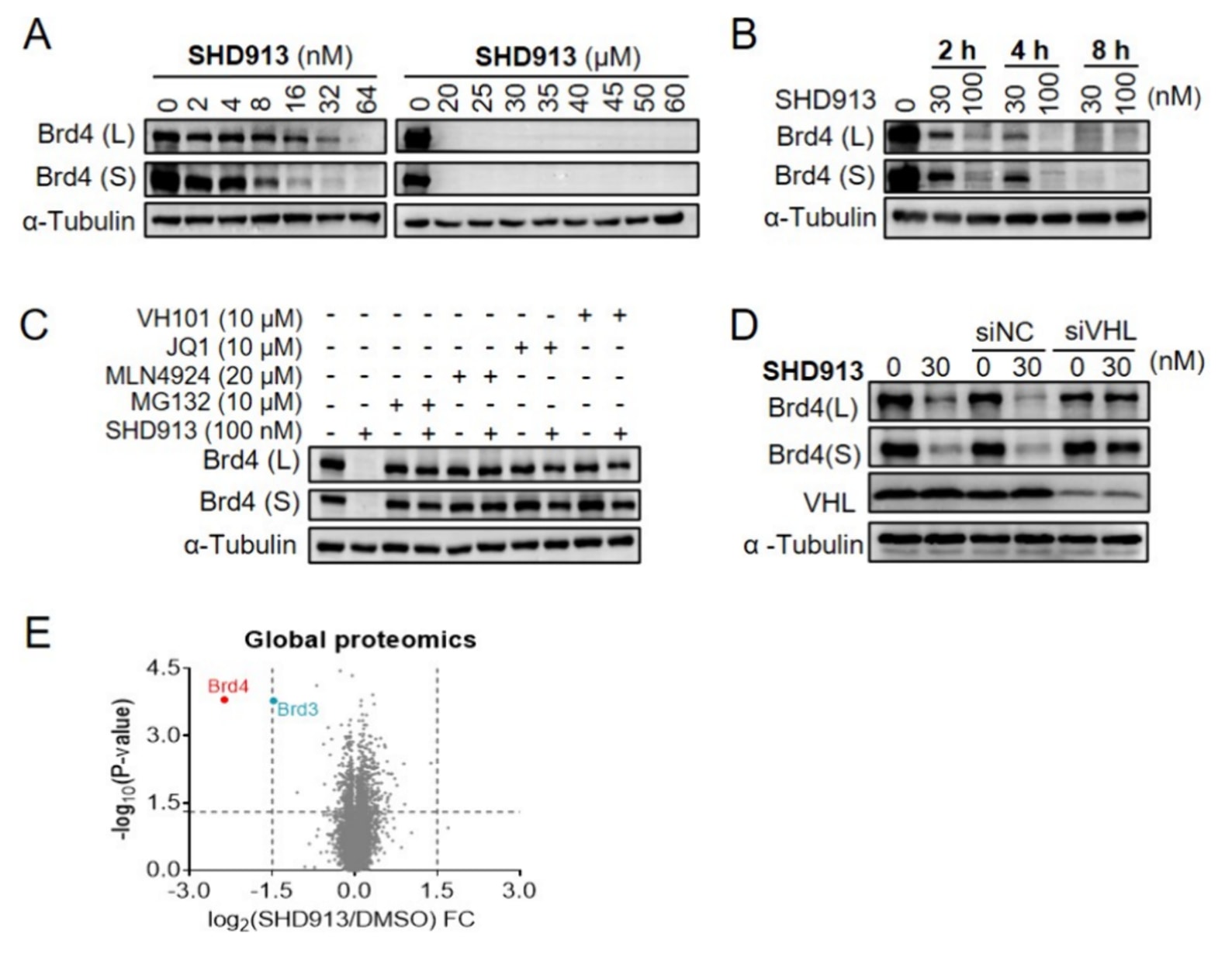 图3|SHD913通过泛素-蛋白酶体降解机制选择性降解Brd4。 (A)PC-3细胞中以不同浓度的SHD913处理24 h后Brd4水平的免疫印迹分析。(B)PC-3细胞中以30 nM或100 nM的SHD913处理不同时间后Brd4水平的免疫印迹分析。(C)PC-3细胞分别预处理MG132(10 μM)、MLN-4924(20 μM)、JQ1(10 μM)或VH101(10 μM)2 h后,再以100 nM SHD913处理2 h时Brd4水平的免疫印迹分析。(D)PC-3细胞经siRNA-VHL(50 nM)处理72 h后,再分别加入DMSO或30 nM SHD913处理4 h后Brd4水平的免疫印迹分析。(E)PC-3细胞分别以DMSO或100 nM SHD913处理2 h后蛋白质组学分析得到的蛋白水平变化情况。