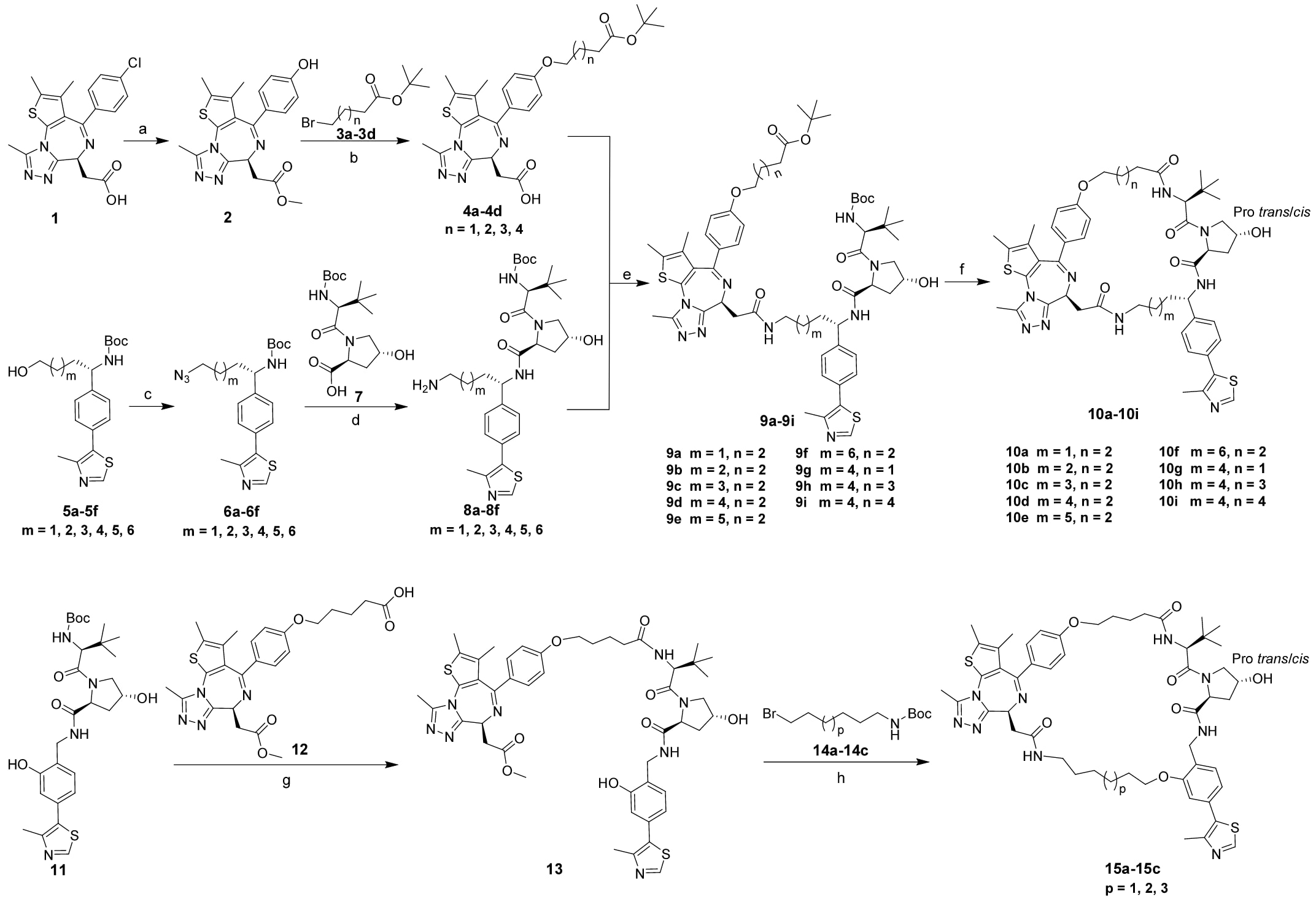 VHL基序由5a至5f合成,其制备方法参考已报道的文献流程。5a−5f经Mitsunobu反应得到叠氮化合物6a−6f,随后脱保护并与化合物7反应生成相应的酰胺,其中叠氮基进一步被还原为伯胺,得到8a−8f。随后,JQ1基序4a−4d与8a−8f偶联生成9a−9i,经脱保护并进行大环化反应,最终得到目标化合物10a−10i。
