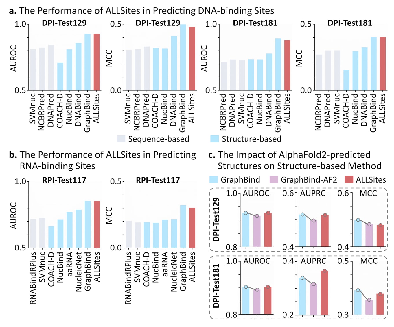 图4|ALLSites在核酸结合位点识别中的性能表现。 a)ALLSites在DNA结合位点预测中的性能,在DPI-Test129和DPI-Test181数据集上以AUROC和MCC作为评估指标,灰色柱表示基于序列的方法,蓝色柱表示基于结构的方法。b)ALLSites在RNA结合位点预测中的性能,在RPI-Test117数据集上以AUROC和MCC作为评估指标进行评估。c)使用AlphaFold2预测结构对结构方法性能的影响,在DPI-Test129和DPI-Test181数据集上评估预测结构对GraphBind性能的影响,蓝色柱表示使用实验解析结构的结果,紫色柱表示使用预测结构的结果。相关原始数据见表S8至表S14。