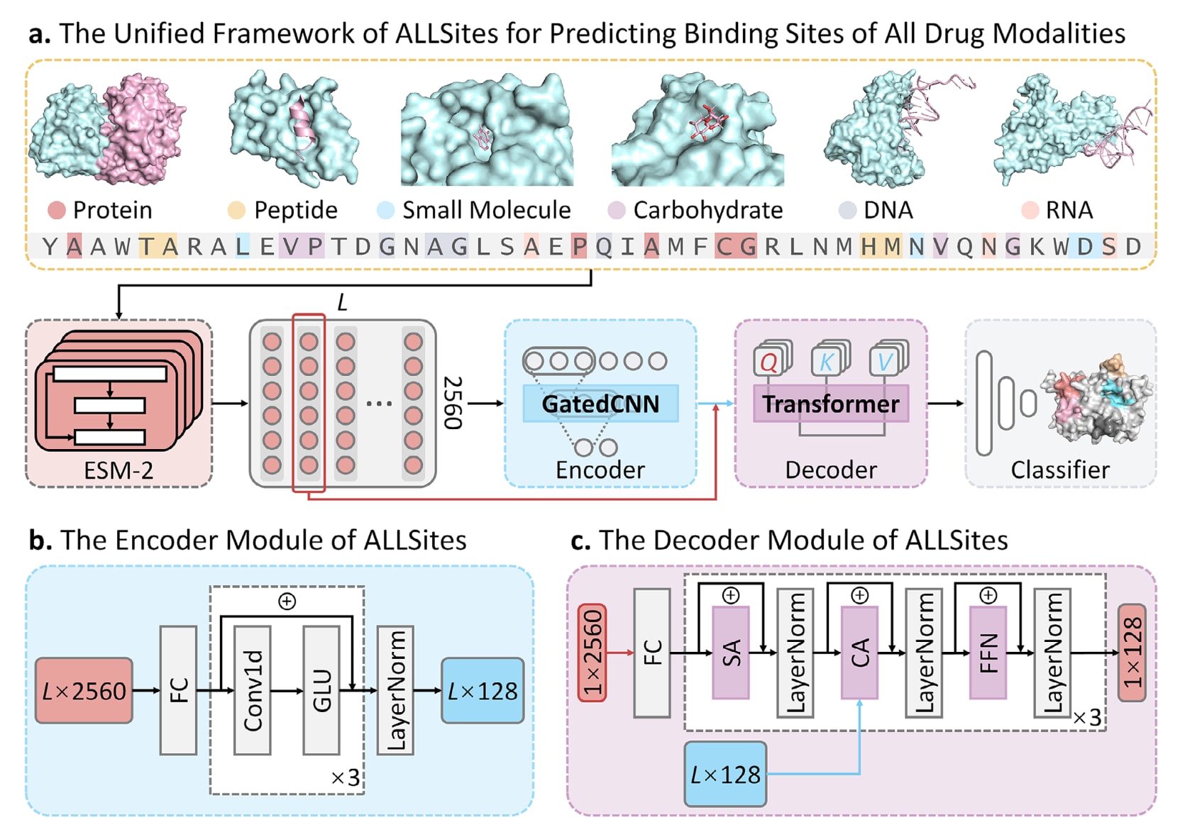 图1|用于预测所有药物分子形态蛋白结合位点的ALLSites框架。 a)ALLSites的整体框架。该方法仅以蛋白序列作为输入,即可实现对多种药物分子形态结合位点的预测,包括蛋白,多肽,小分子,糖类,DNA和RNA。模型整体由三个主要模块组成,分别为用于处理ESM-2生成表示的蛋白特征编码器,跨注意力解码器以及分类模块。b)编码器模块的结构。编码器本质上是一个门控卷积网络,用于从蛋白序列中同时提取局部特征和全局特征,其由一维卷积层和门控线性单元激活函数构成。c)解码器模块的结构。解码器以残基级表示和全局蛋白特征作为输入,通过跨注意力机制学习残基之间的相互作用信息。编码器和解码器均由三层结构组成。FC表示全连接层,SA表示自注意力机制,CA表示跨注意力机制,FFN表示位置前馈网络。