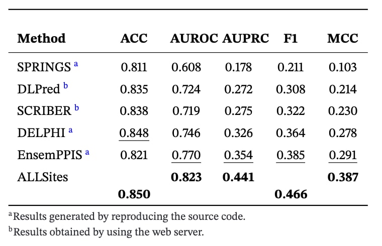 表1|ALLSites在PPI-Test70数据集上的性能评估结果。每一项评估指标中表现最优的结果以加粗标示,次优结果以下划线标示。